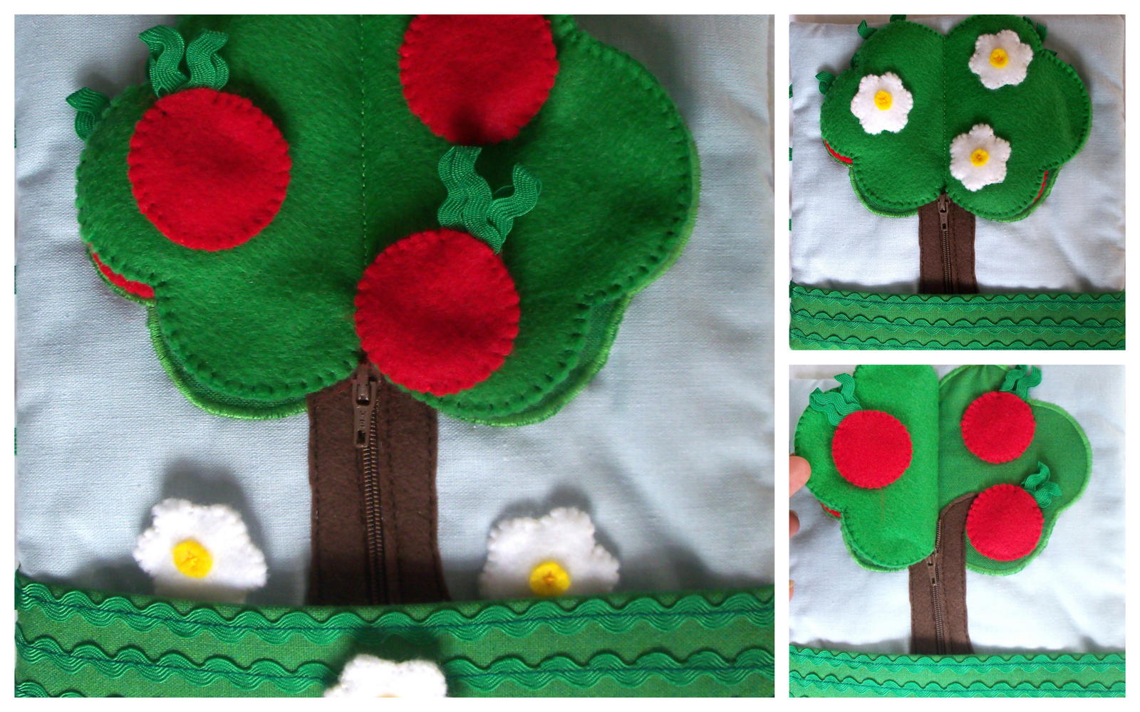 Третья страничка - яблонька. Сначала дерево цветет, потом на нем вырастают вкусные красные яблочки. Цветочки и яблочки как обычно на "липучке". Как дополнительный сенсор - застежка-молния.