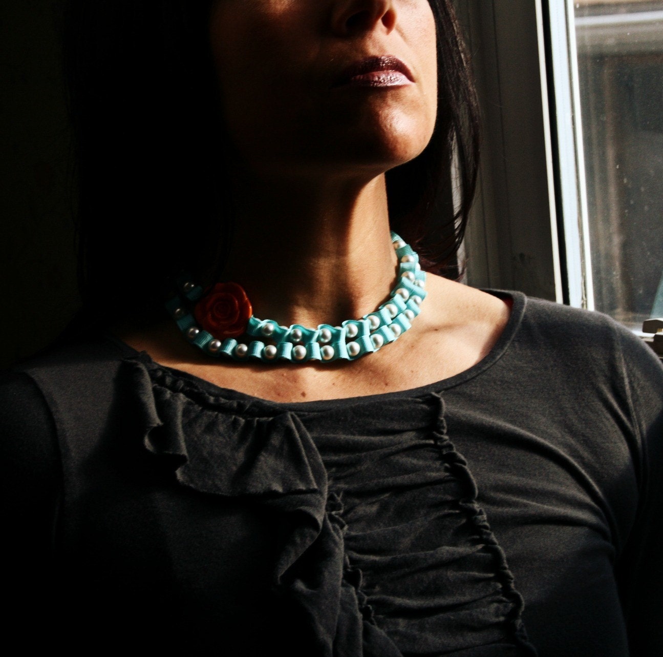 [570x]SALE/// Tillie Rose and Pearl Ribbon Necklace in Aqua and Tangerine
