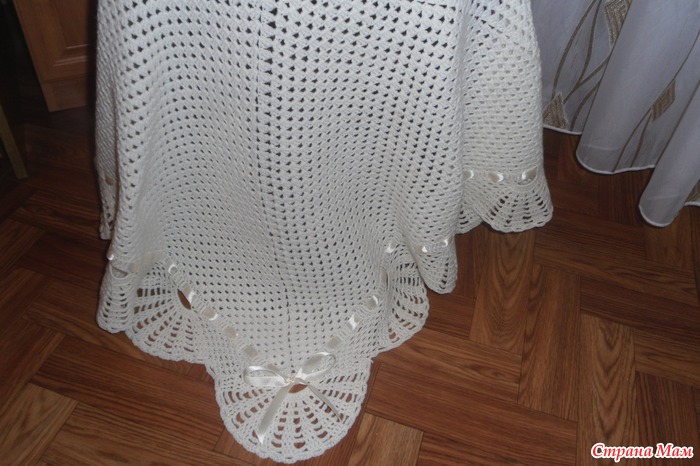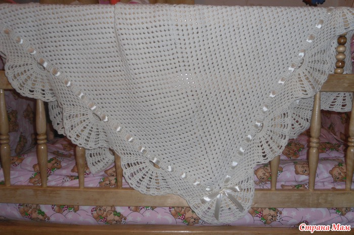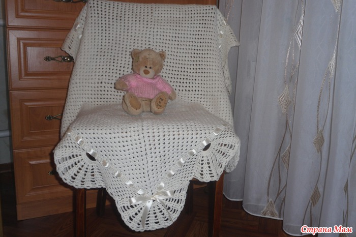 Размер готового пледа 90 на 90 (весит около 350 грамм). Крючок использовала № 3, 5. Использовала атласную ленту шириной 1 см.,