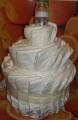 | Красиво преподнести можно если не все, то очень многое — даже... памперсы! В самом деле, памперсы — это то, чему будут рады в любом доме, где есть маленькие дети, но одно дело вручить счастливым родителям стандартную пачку, и совсем другое - соорудить ни много, ни мало — трехэтажный памперсный торт. Нам потребуется большая, штук на 70, пачка памперсов, а также всевозможные мелочи — косметика в маленьких тюбиках, небольшие игрушки, бутылочка. Вначале сделаем верхний "этаж": возьмем бутылочку и уложим вокруг нее слой памперсов. Перевяжем эту конструкцию веревочкой. (фото 6) Затем выложим на столе длинный ряд памперсов "внахлест" и завернем в него наш "верхний этаж". Торт стал двухэтажным! (фото 7) Нижний, самый массивный "этаж" делается точно так же. Если при сборке памперсы будут расползаться, воспользуйтесь малярным скотчем — держит он прекрасно, но, в отличие от обычного, легко снимается, и памперсы остаются целехоньки (фото 8). | |||