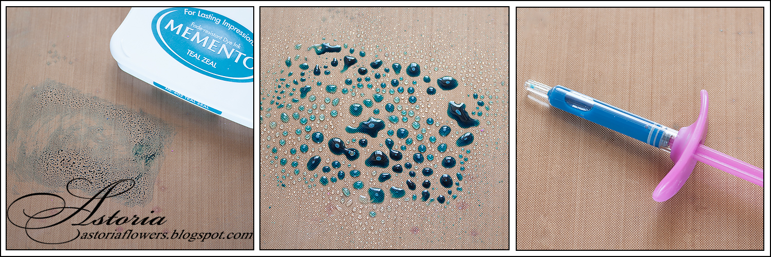 Нанесите чернила подушечкой на коврик ( я использую многоразовый коврик для выпечки, он гораздо дешевле, чем продаёт дядя Хольц под другим названием). Побрызгайте водой, соберите капли в одну лужицу и наберите полученный раствор в инсулиновый шприц.