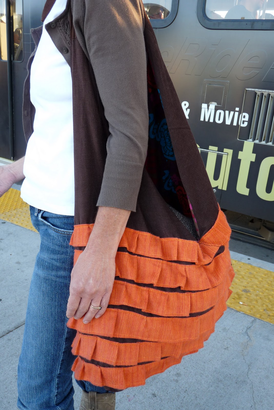 6. Сшейте две боковые края и нижний край вашего 8 "х 45" прямоугольник, в нижней части перекрывается часть подкладки треугольники, оставляя верхний край открытым. Затем, через равные промежутки, шить вертикальными линиями разделить большой карман на четыре меньших карманы (чтобы найти равные промежутки, я сложил ткани в два раза, то в полтора раза и отмечены складки ткани перо).