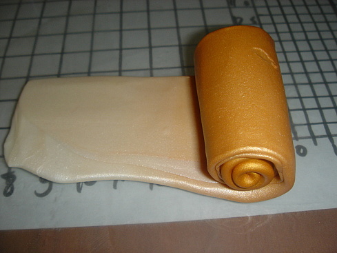 [показать] 7- И еще раз складываем и раскатываем. И еще - сколько душе угодно (у меня обычно от 5 до 10 раз получается), или пока переход цвета не станет совсем плавным, а пласт коротким и широким - тогда его можно и в колбасу скрутить, если надо. Цветов можно брать не два, а больше. Тогда просто центральные цвета нарезать на ромбики, а два крайних - на треугольники, и из этого всего сделать прямоугольник, который также режется поперек на полоски.