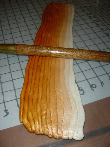 [показать] 4 - Каждый шарик вытягиваем в длиииинную колбаску. Длина важна, поскольку потом надо будет еще несколько раз складывать их пополам - чем длиннее первоначальный пласт, тем дольше будет возможность его складывать. Укладываем эти колбаски (раскатанные до одной длины, ширина не очень важна) плотно друг к другу от более светлого оттенка к более темному по порядку