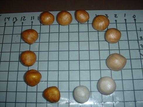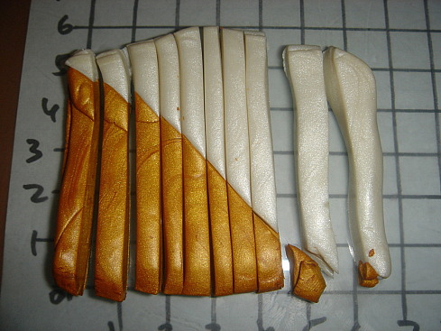 [показать] 3- Смешиваем цвета в каждой полосочке - получается 10-12 кусочков разного оттенка, добавляем по 1 кусочку "чистого" цвета (в примере - золотой и белый) - итог 12-14 шариков