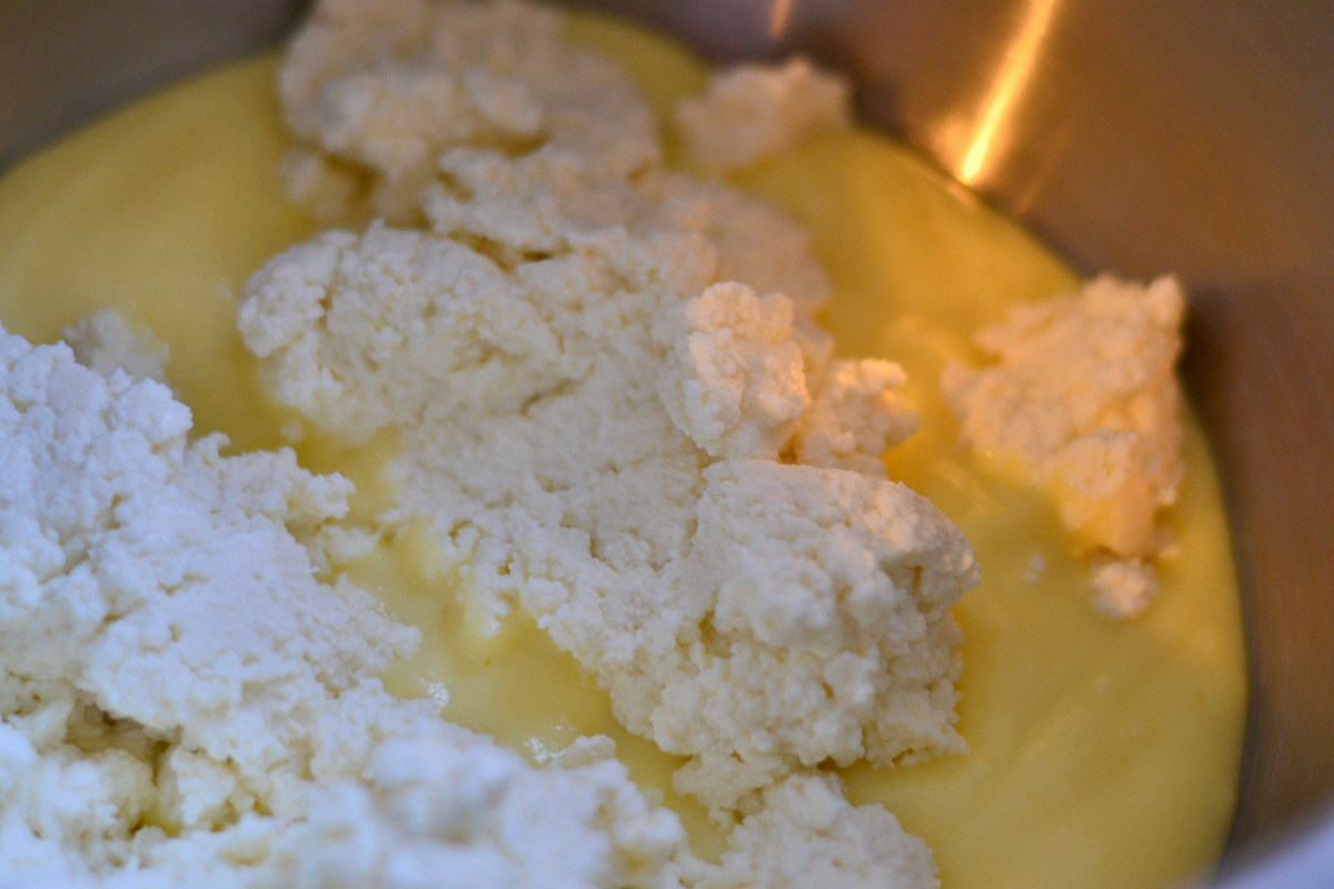 Готовим основной сырно-заварной крем. В остывший заварной крем добавляем Рикотту и сахар. Взбиваем. Добавить туда же яйца,не переставая взбивать,затем крахмал, молоко,ваниль, сок лимона и цедру. В конце взбивания добавить сливки. Взбивать на средней скорости миксера.Полученная масса будет жидкой. Но не пугайтесь,при выпекании и уже охлаждении она застынет. Вы все делаете правильно.