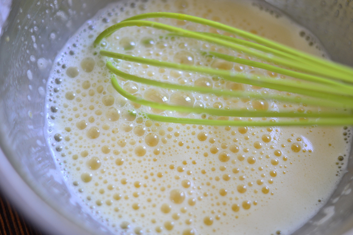 Добавляем крахмал и снова хорошо перемешиваем,чтобы не было комочков. Тем временем ставим молоко на огонь и подогреваем его,но не кипятить. Как только молоко подогреется,влить немного его в яичную смесь,перемешать и вылить обратно всю смесь в кастрюлю тоненькой струйкой, не забываю помешивать венчиком. Варить до загустения.