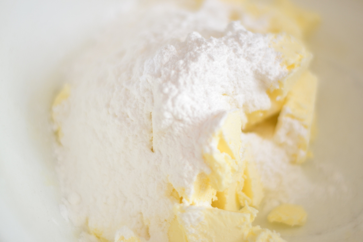 Готовим песочное тесто. Растираем сливочное масло с сахарной пудрой.