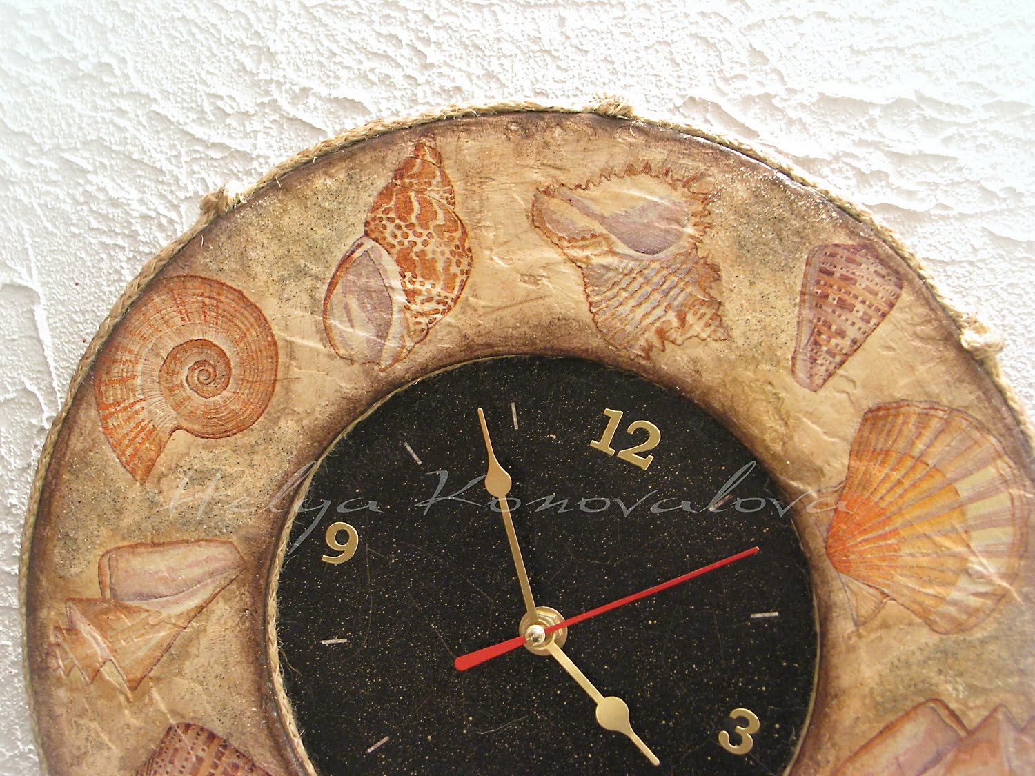 И еще одни часики в смешаной технике на морскую тему......Здесь декупаж по шпатлевке, сверху посыпан песочек настоящий!!! с Баренцева моря!!!!!