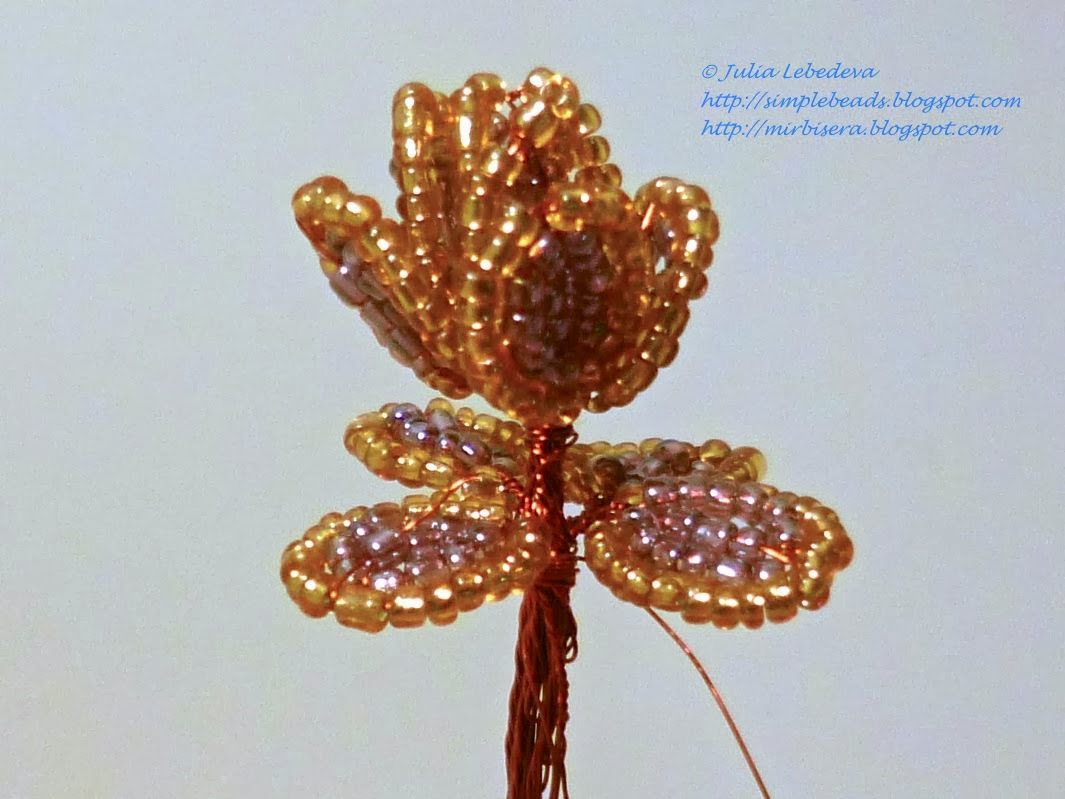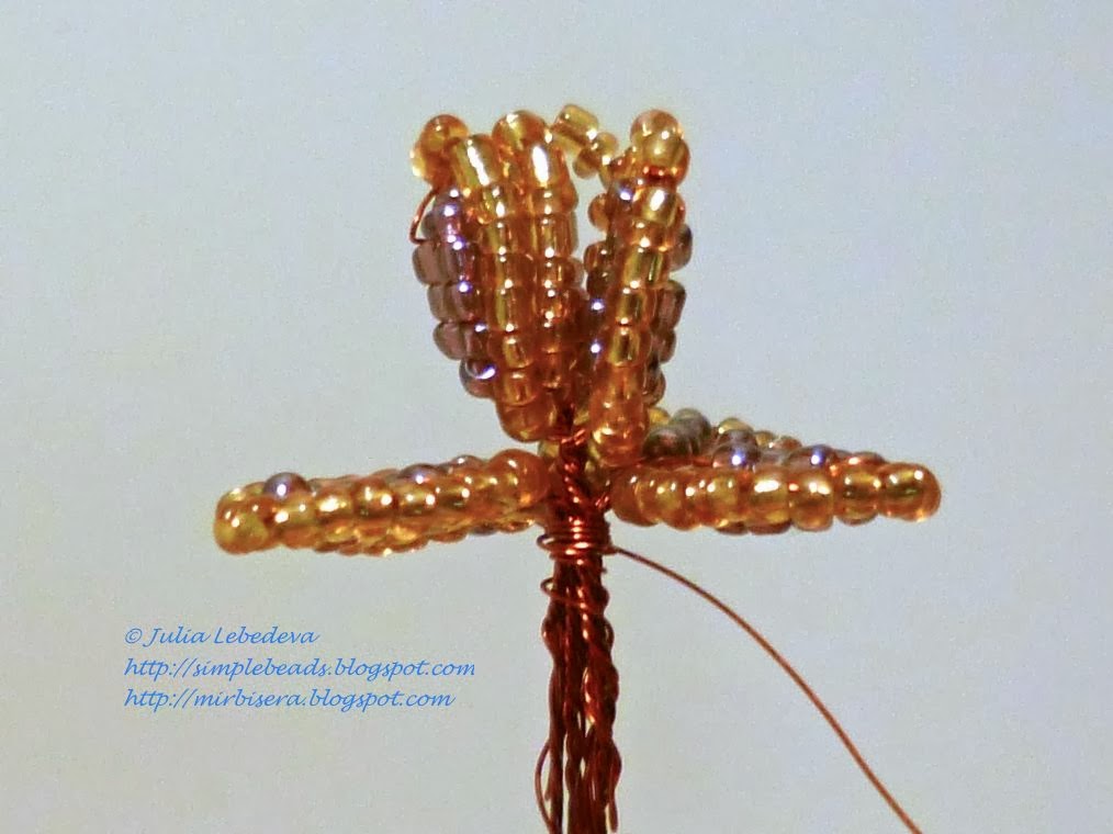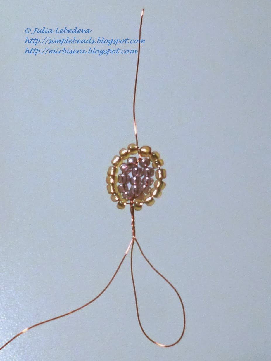 Второй круг делаем из жёлто-коричневого бисера; для каждой половинки второго круга набираем по 8 бисеринок. Обратите внимание: в зависимости от размера бисеринок их количество может отличаться от указанного; главное, чтобы каждый новый ряд бисеринок плотно прилегал к предыдущему ряду, а какое при этом будет фактическое количество бисеринок в каждой половинке круга, здесь не так важно.