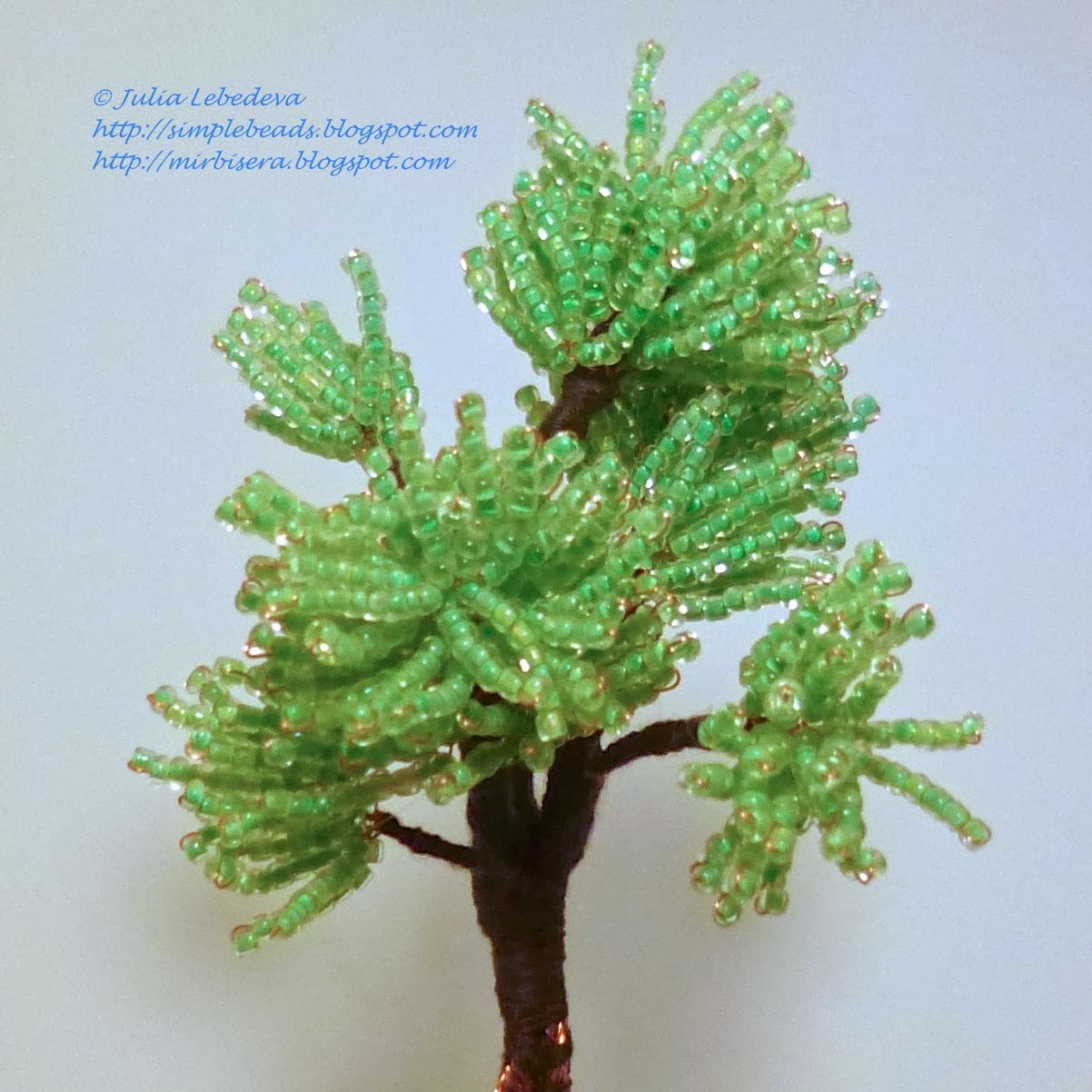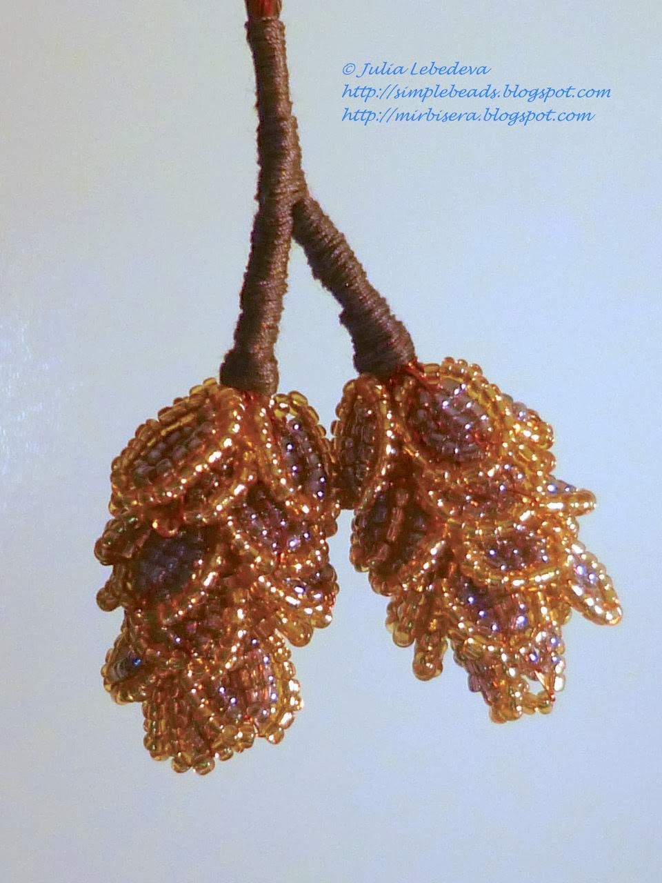 - бисер размера № 11; для шишек я взяла жёлто-коричневый и серый бисер, а для веточек - светло-зелёный;