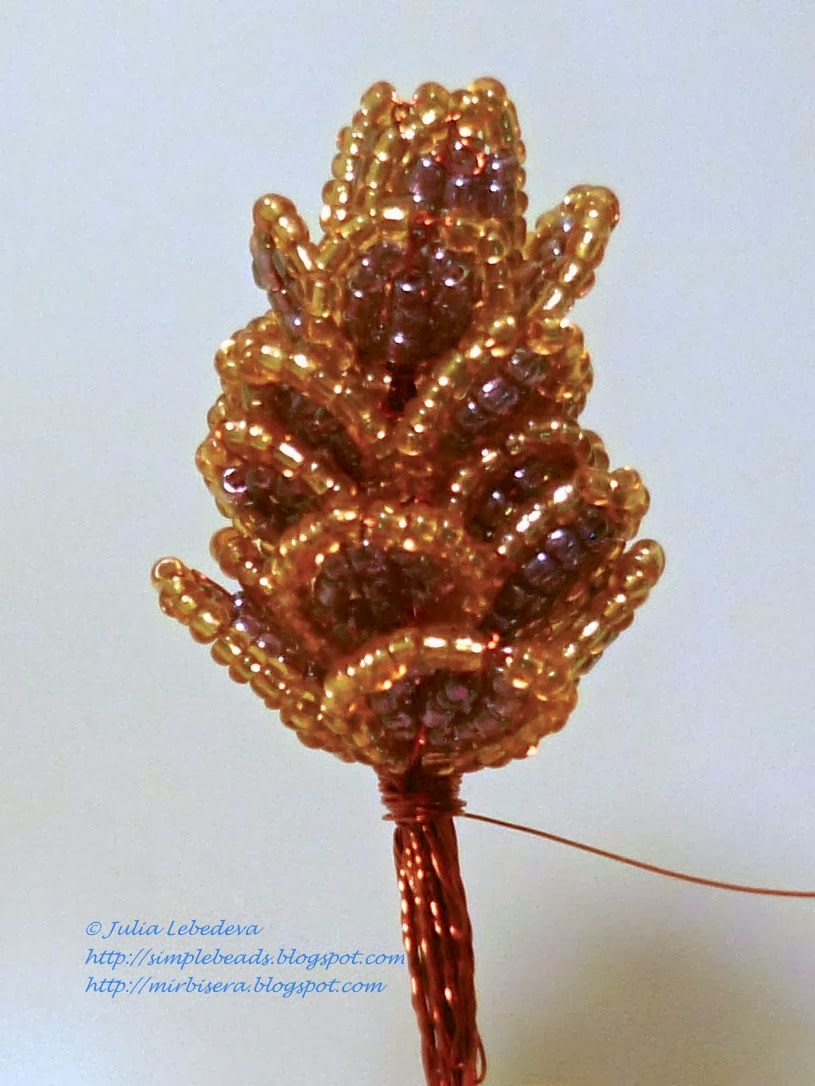 Таким образом прикрепляем все остальные ряды “пластинок”. Поскольку всего мы сплели 23 “пластинки”, то наша шишка состоит из первоначального бутончика и 5 рядов “пластинок”.