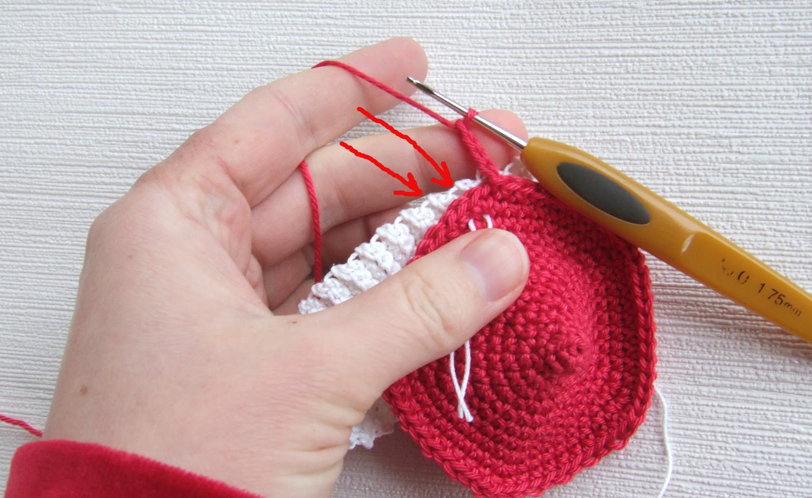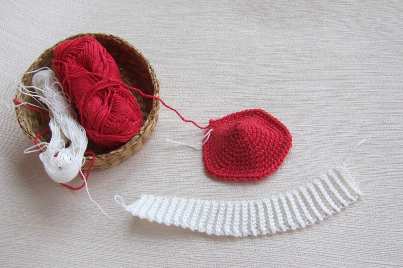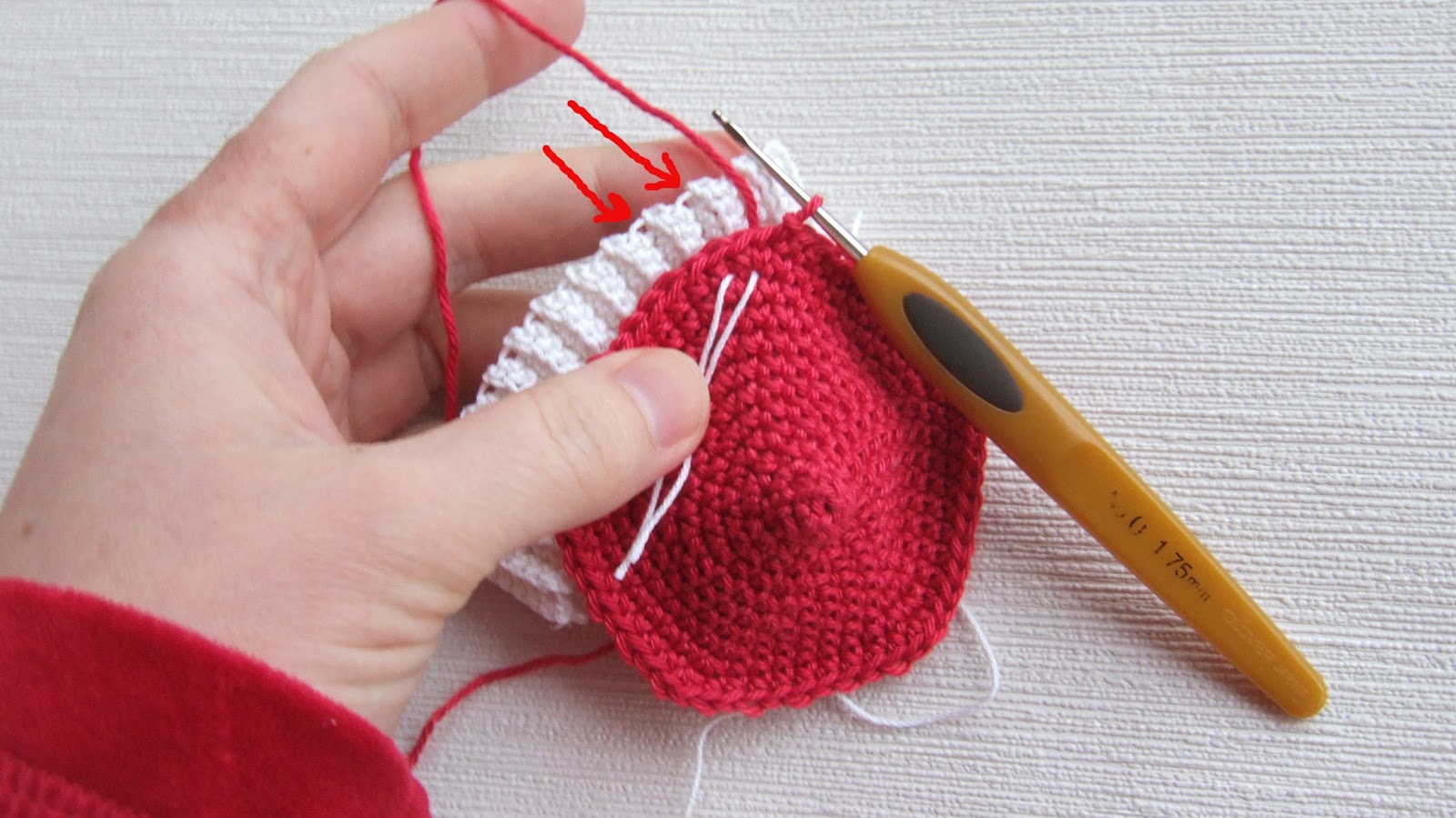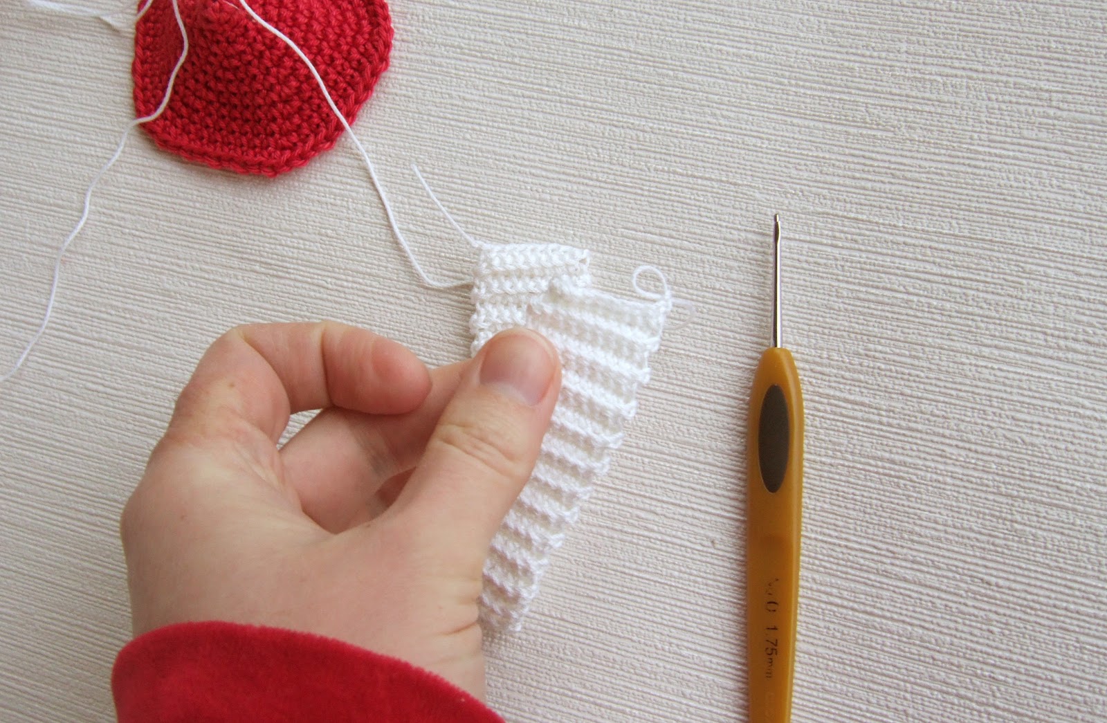 3. Далее белой нитью вяжу резинку. для этого 9 в.п. и рядами туда/обратно столбики без накида, цепляясь за заднюю часть петли. Вяжу до тех пор, пока не будет 27 рубчиков (т.е. те самые 54 петли красной шляпки)