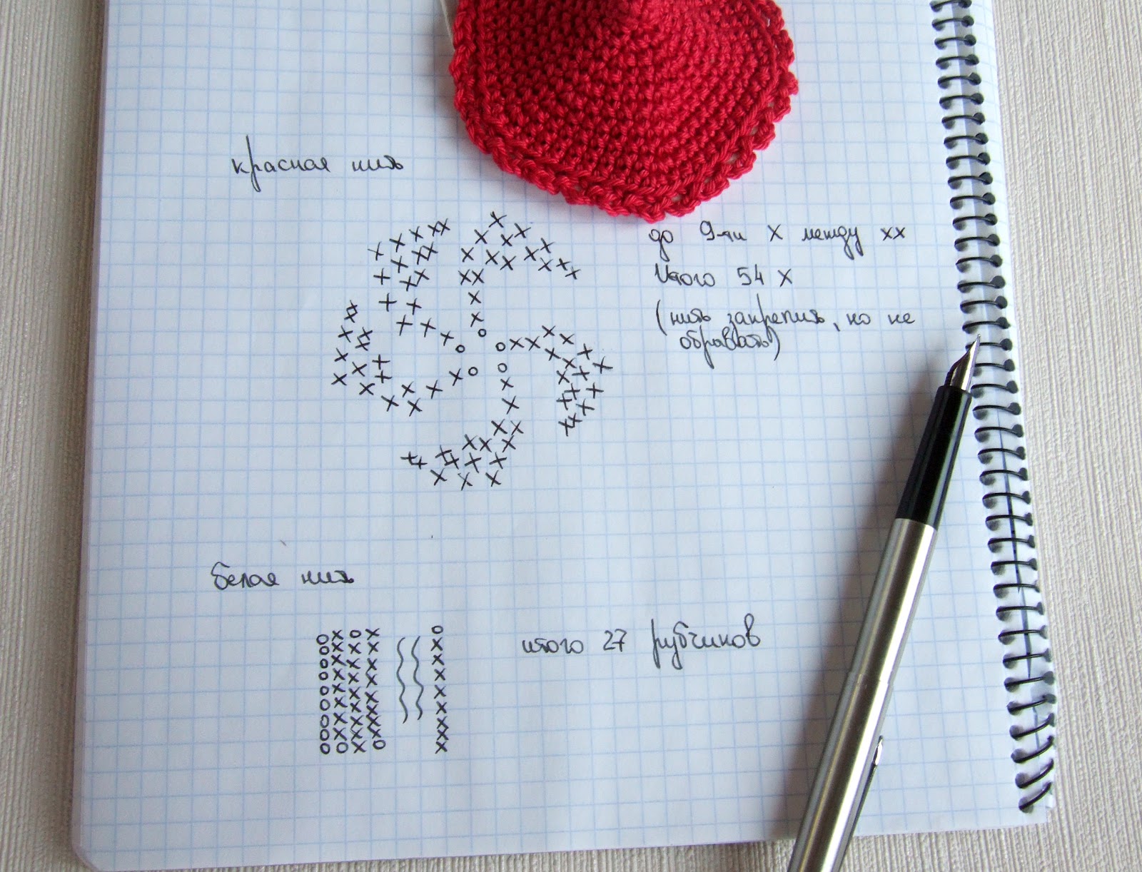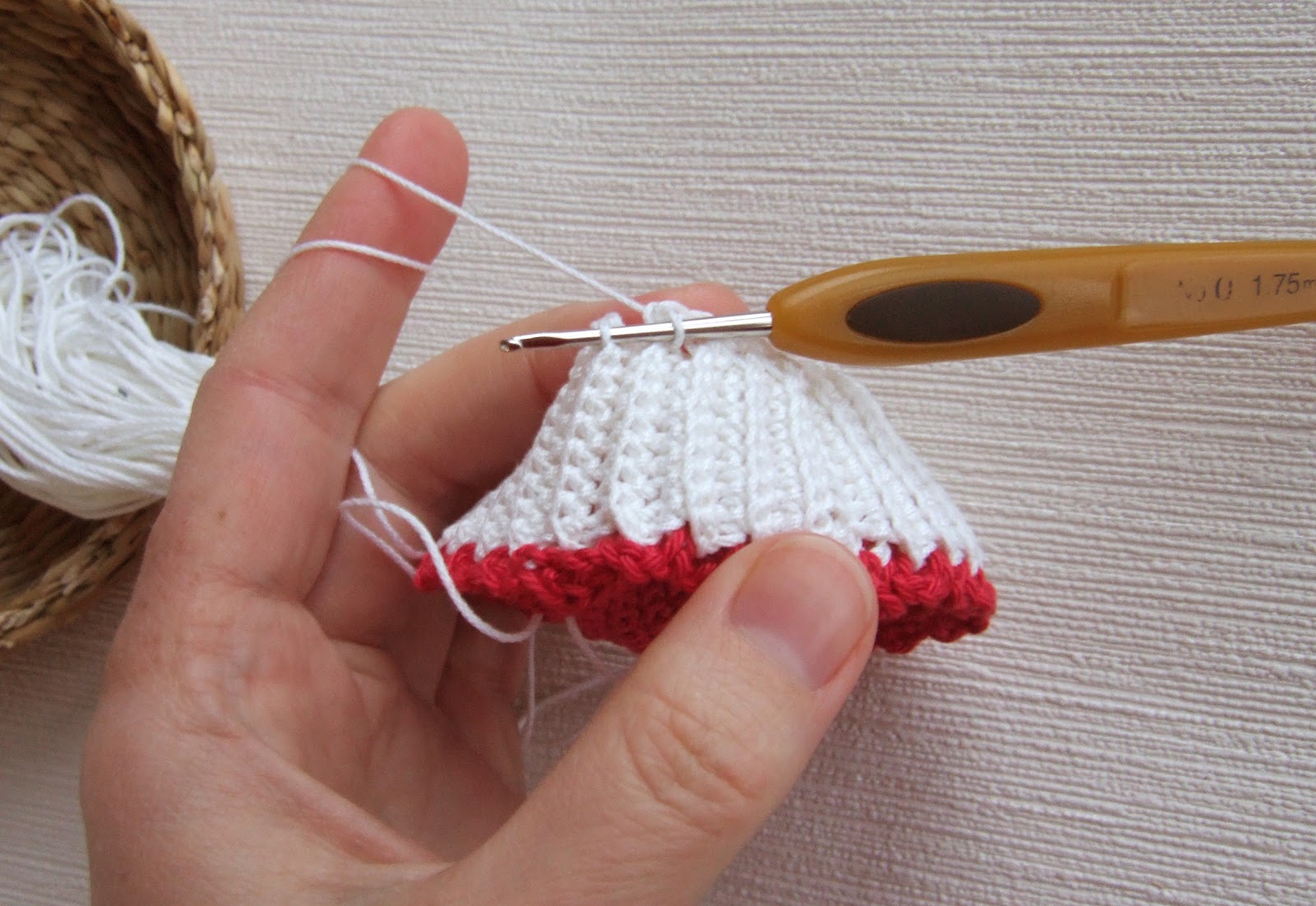 7. В серединку ничего не клала, шляпка довольно плотная и кокетливо может загибаться то наверх, то вниз. Для того, чтоб при висе шляпка была шляпкой, а не бело-красным шариком, аккуратно пришиваю бусинки к шляпке, но на белой части всегда между рубчиками должна выходит иголка.