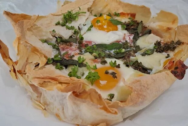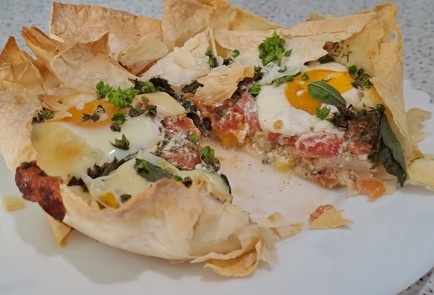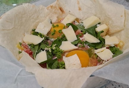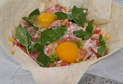 15.Закрыть все пергаментом, но не плотно. Выпекать в духовке при температуре 180 градусов примерно 10 минут до готовности яиц.