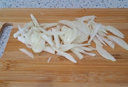 6.Сладкий перец нарезать соломкой и выложить в форму.