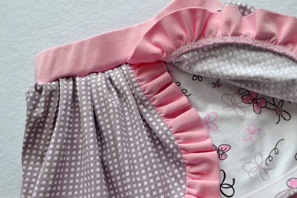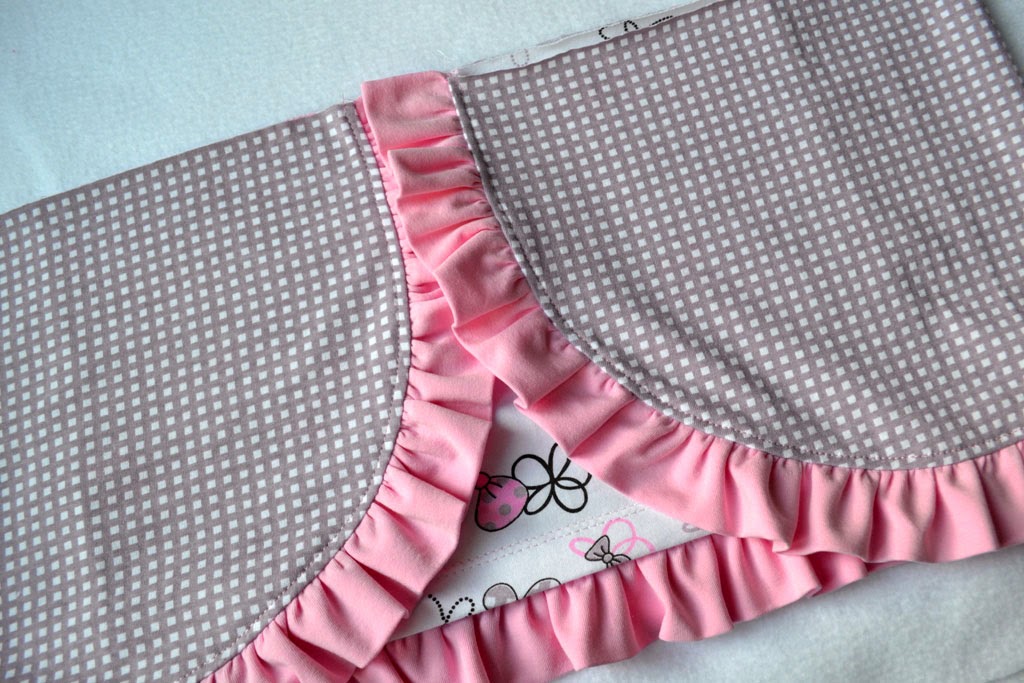 Прикалываю/ приметываю волан к нижнему срезу верхней юбочки, пришиваю на оверлоке.