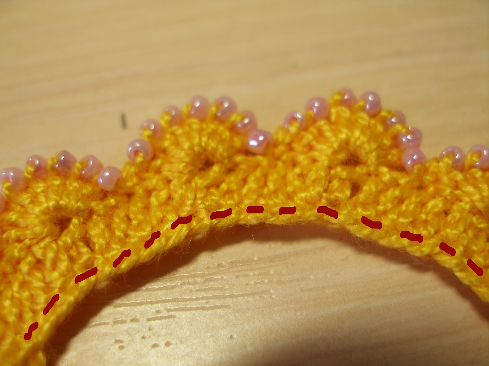И этой ниткой прокладываем шов "вперед иголку" по нижнему краю, вводя крючок в воздушные петли. Т.к. я выполняла этот шов той же нитью, я нарисовала в фотошопе штрихами нужные стежки:)))