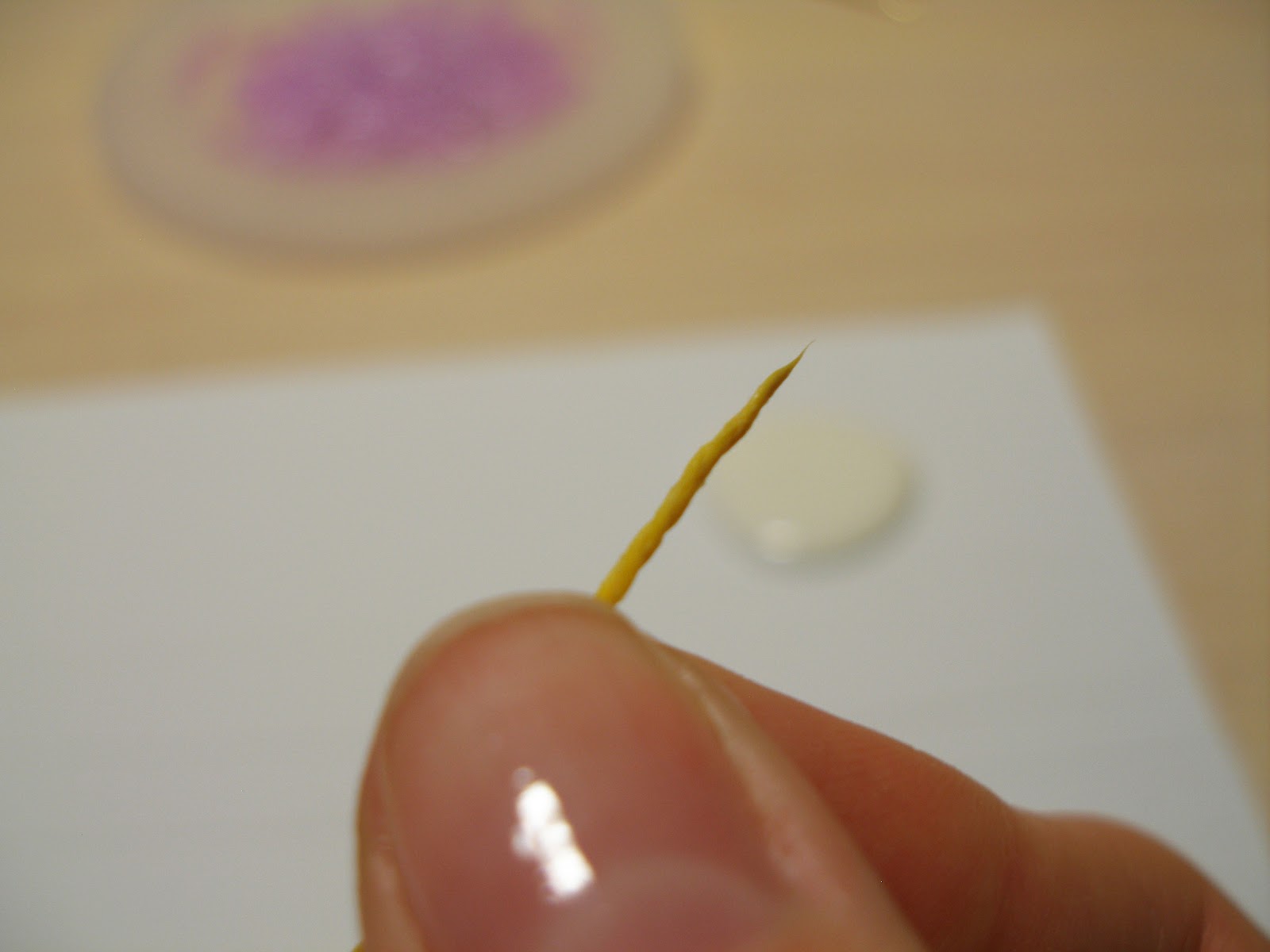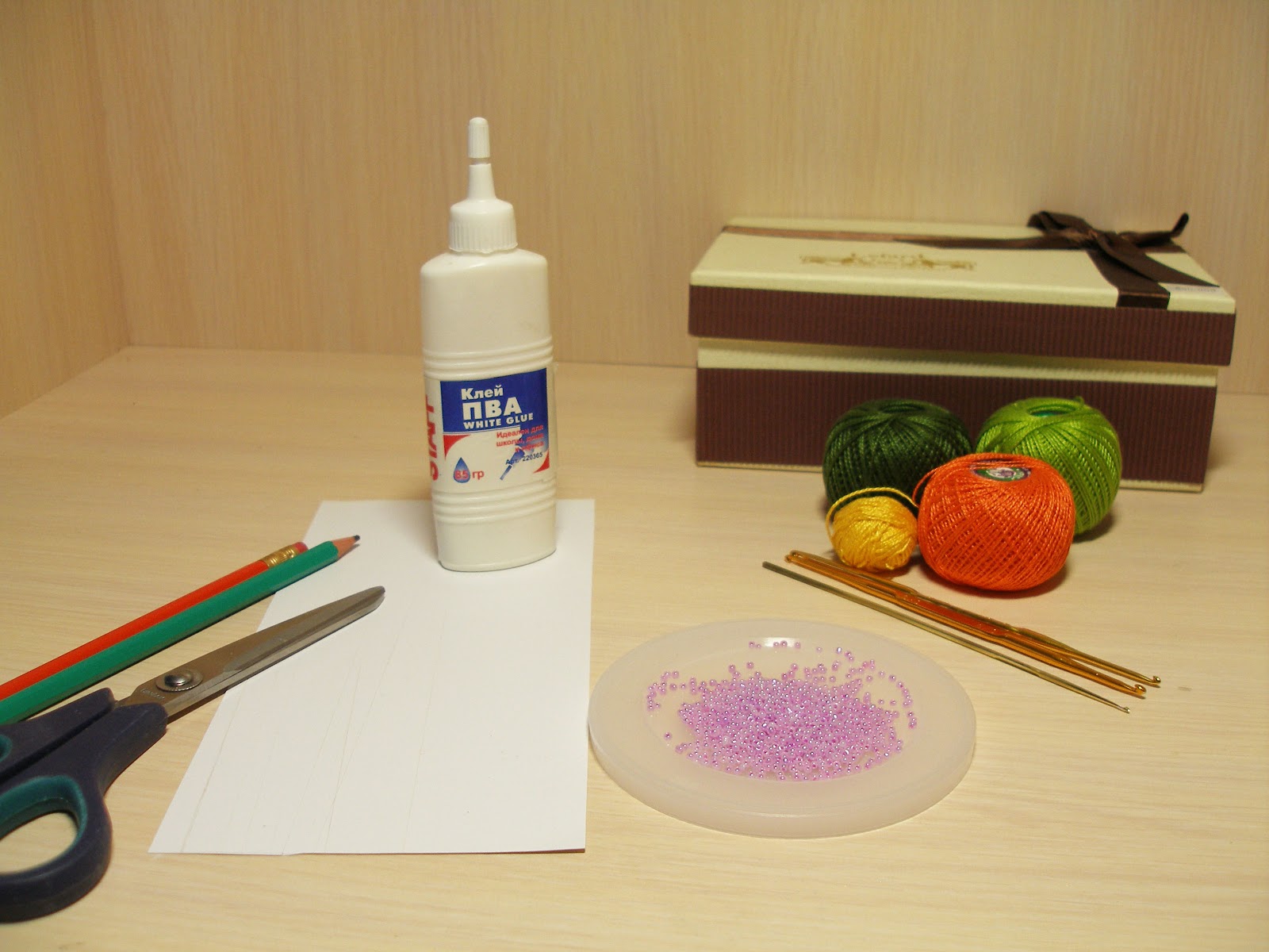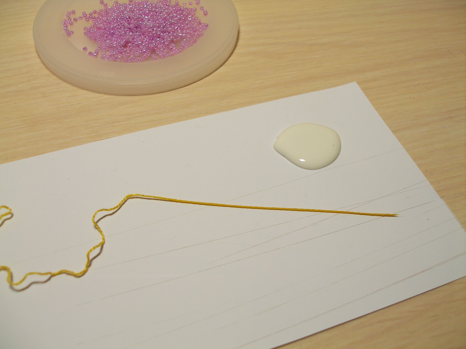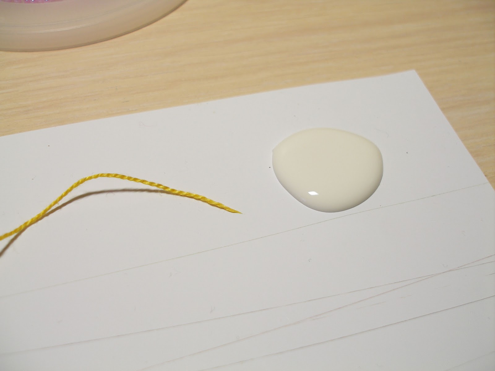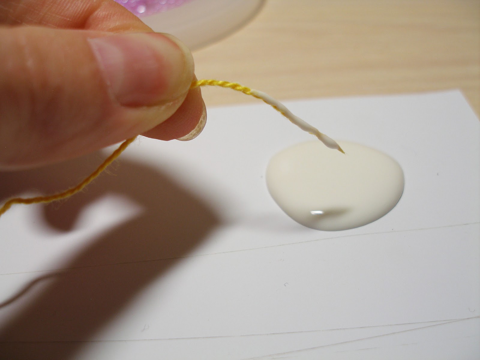 На бумагу капаем немного клея ПВА и обмакиваем в него конец нити.