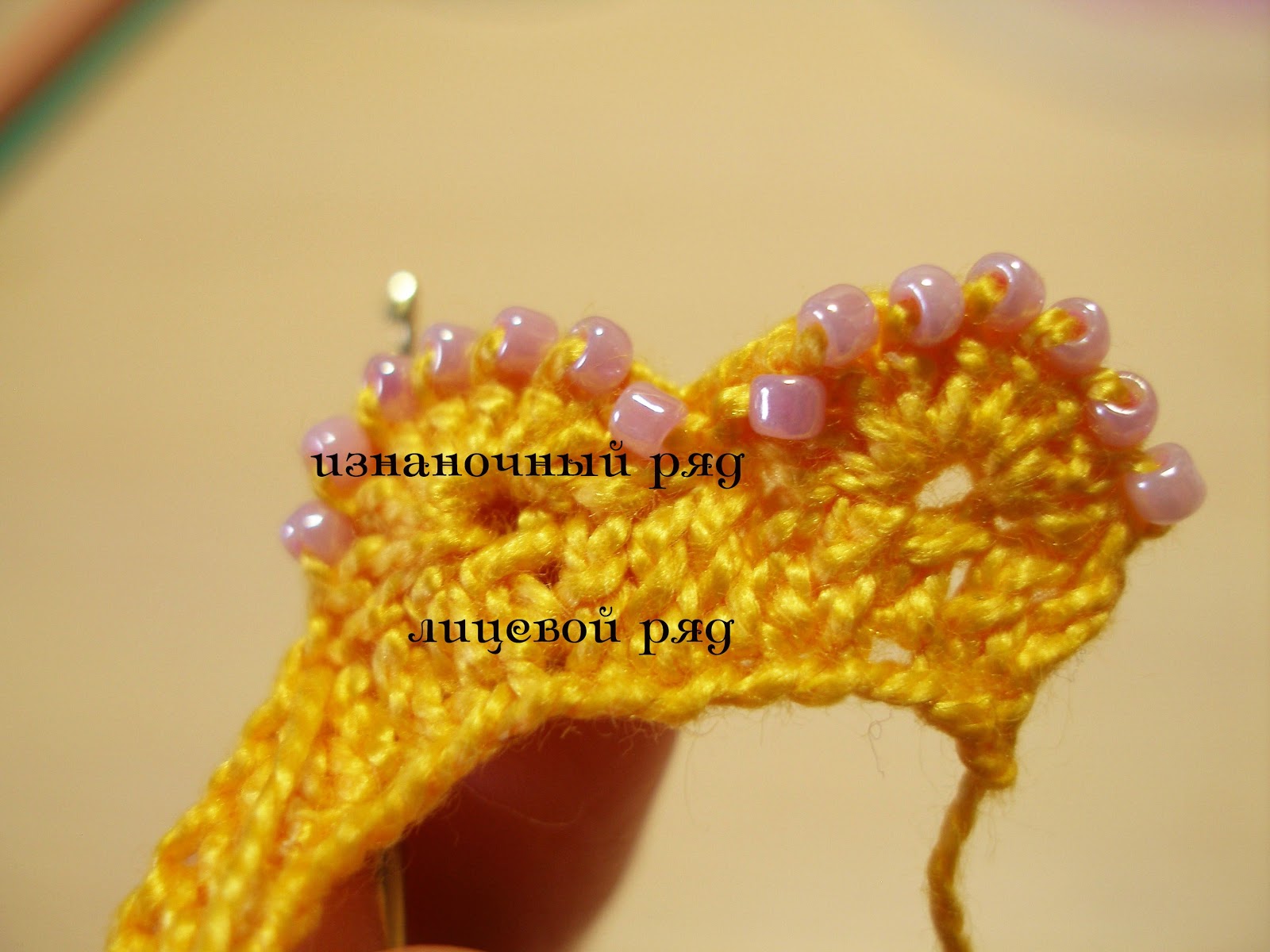 Обращаю ваше внимание, что бисеринка оказывается СЗАДИ вязания, то есть весь бисерный рисунок окажется на изнаночной стороне. После накида вытягиваем петлю, чтобы дальше провязывать СТ. С Н. Смотрим сверху - бисеринка ЗА работой.