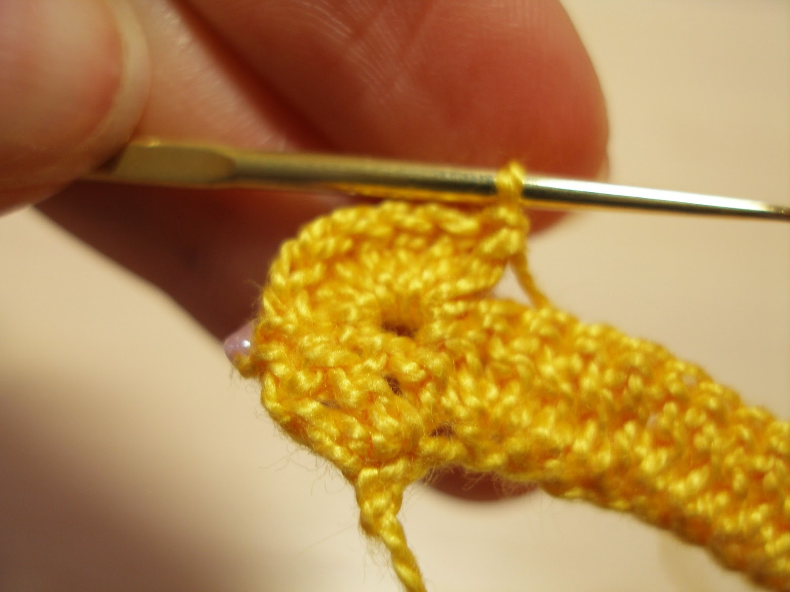 И очередной кустик из 7 СТ. С Н. с бисером. На фото видна петля, накид с бисером и петля, протянутая из полотна. Вид сверху: