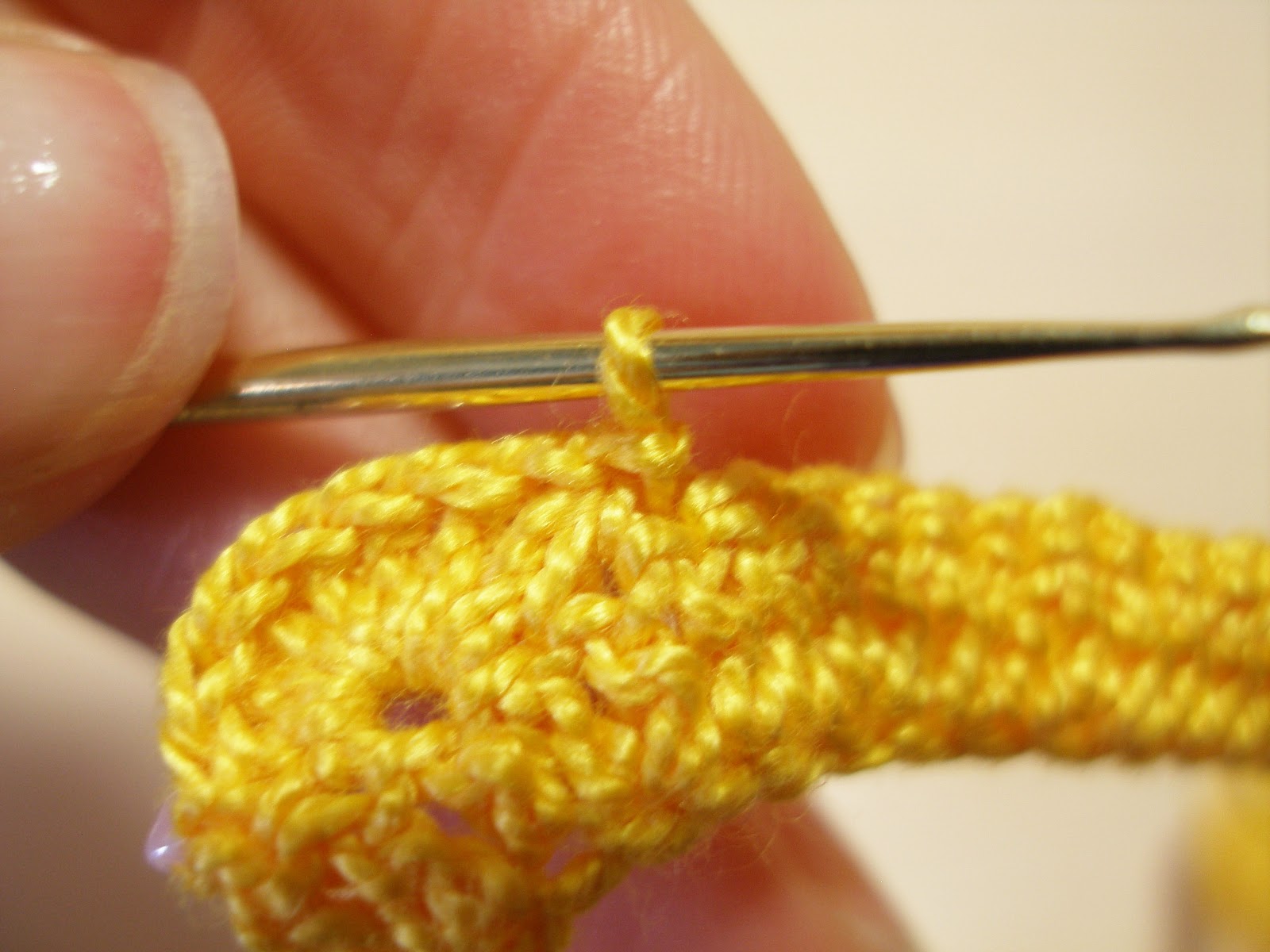Смотрим схему - под третью петлю нам нужно провязать 7 столбиков с накидом. Мы готовы!