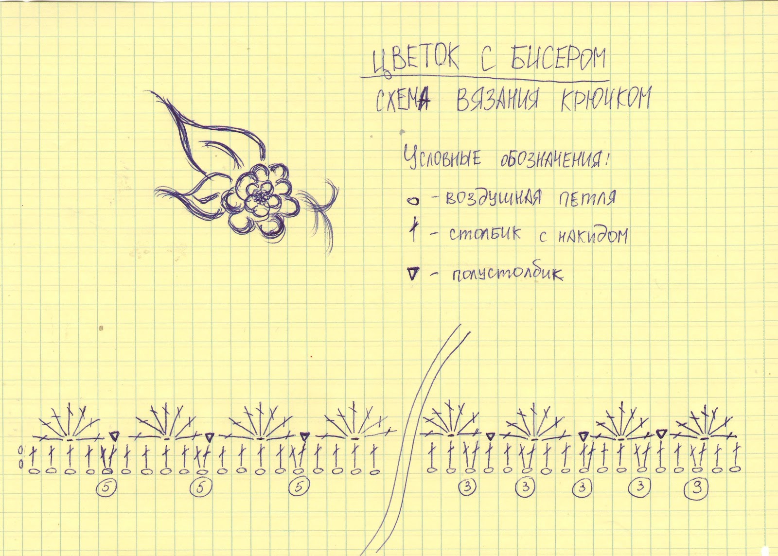 Уж так сложилось, что с графическими редакторами я почти не дружу, поэтому схему вязания цветка я не смогла сделать на компьютере. Я нарисовала ее от руки на бумаге, показываю вам отсканированное изображение моих кривулек.