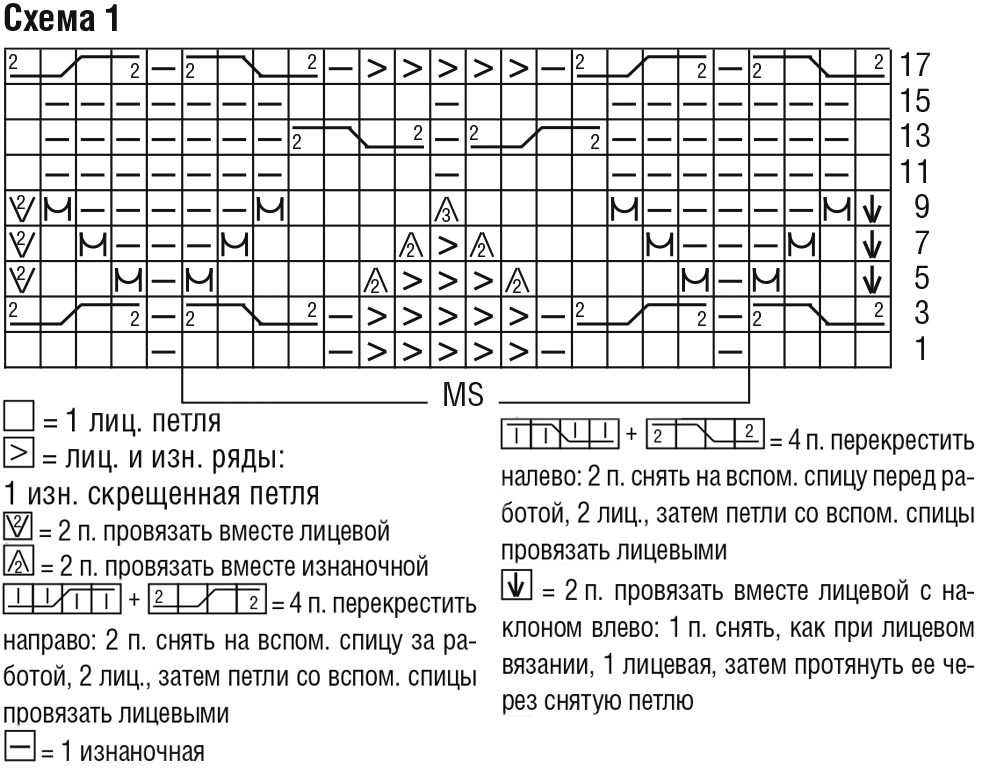 Количество петель кратно 16 + 9 п. + 2 кром. Вязать по схеме 1. На схеме даны только лицевые ряды. В изнаночных рядах петли провязывать по рисунку или как указано. В ширину начинать с петель перед раппортом, повторять раппорт, заканчивать петлями после раппорта и кром. В высоту выполнить 1 раз с 1-го по 18-й р., затем повторять с 5-го по 18-й ряд.
