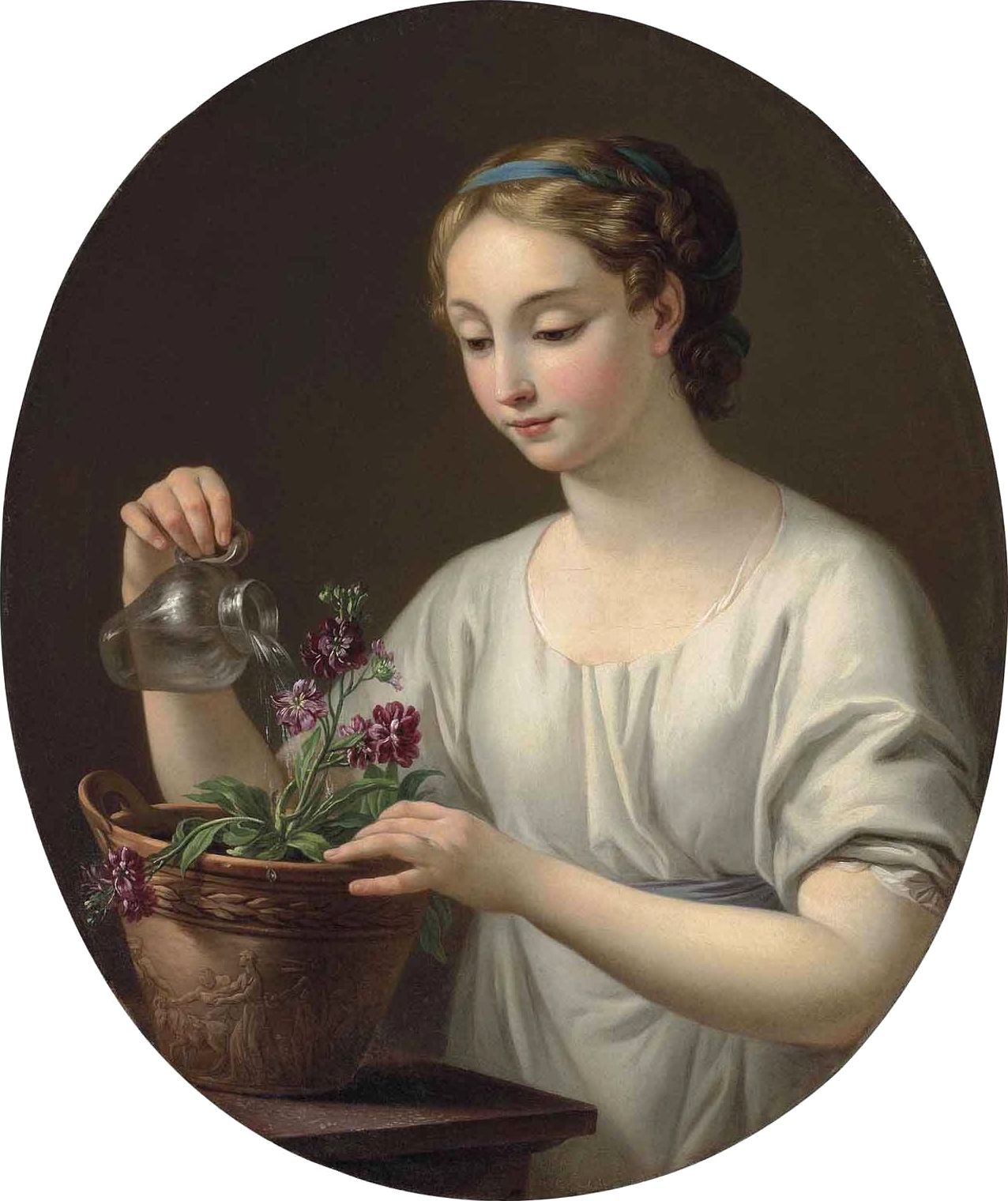 A young woman watering a pot of matthiola