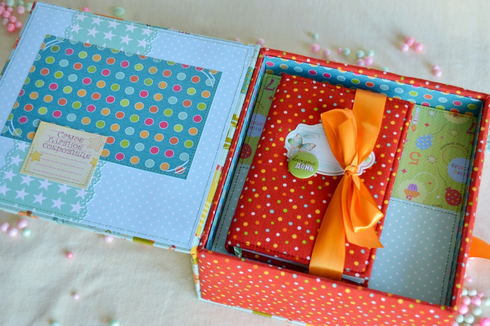 Эта шкатулочка для моей дочки. В ней предусмотрены маленькие коробочки для памятных вещей и место для первой фотографии. За подложкой есть карман с тегом для важной информации. Декор обложки старалась сделать максимально плоским, т.к. храниться коробочка будет на полке как книга, рядом с альбомами для фотографий.
