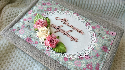 В работе использовала переплетный картон, льняную ткань с розами, набор бумаги "Мамины сокровища" от "ScrapBerry`s", чипборд, ленточки.