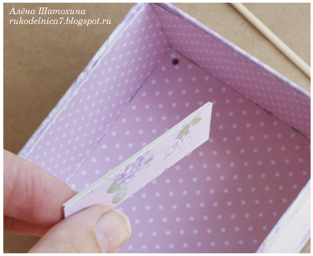 Очередь очень важных деталей. Пластинку пивного картона (высота равна высоте ящичка, 5 см, ширина около 2 см) обклеиваем скрап-бумагой и фиксируем клеем Момент, закрывая уголок с отверстием для поворотного механизма. Это красиво и обеспечивает дополнительную фиксацию стержня.