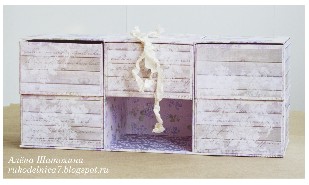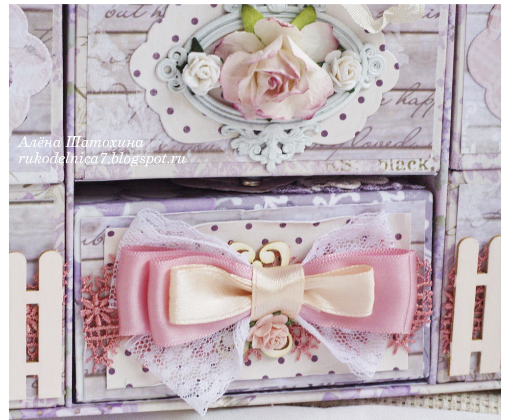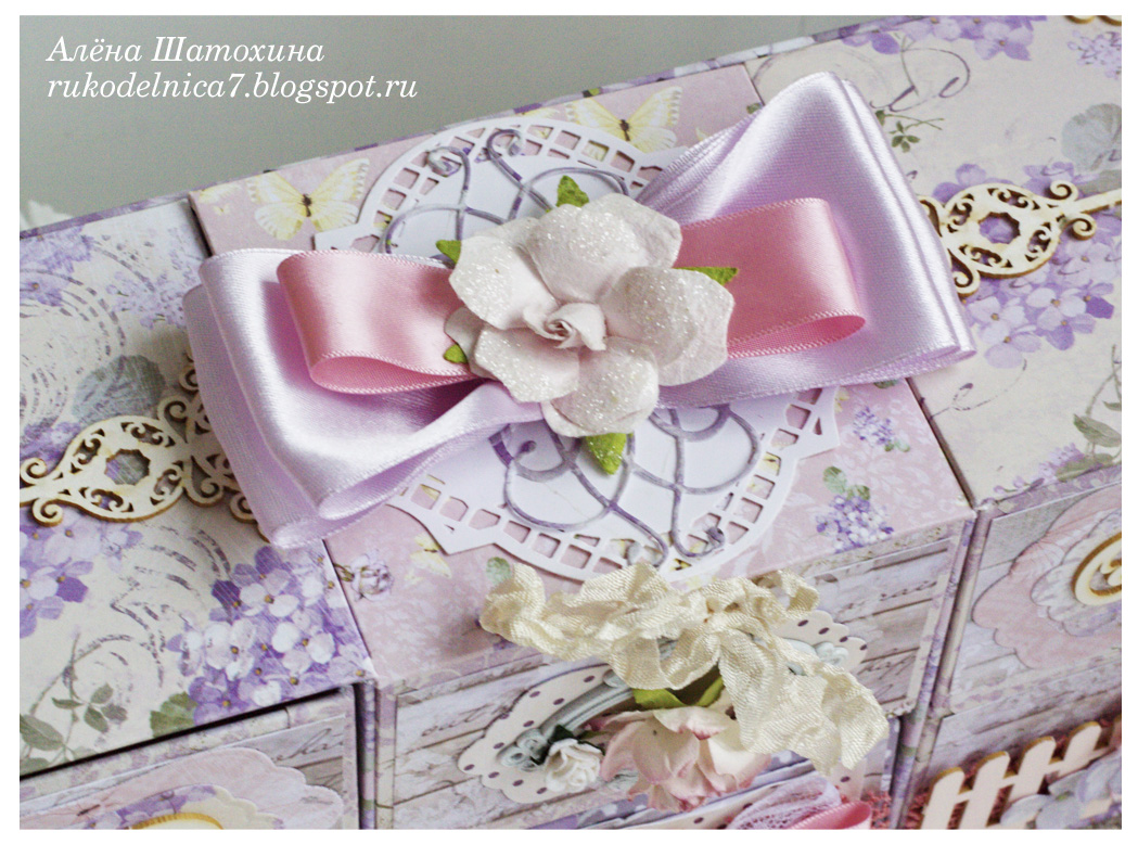 Шаг 6. Оформляем средний ящичек с открывающейся кверху крышкой. В качестве способа крепления крышечки я выбрала атласные ленты) Приклеиваем ящичек на свое место. Очень важно не ошибиться с высотой)