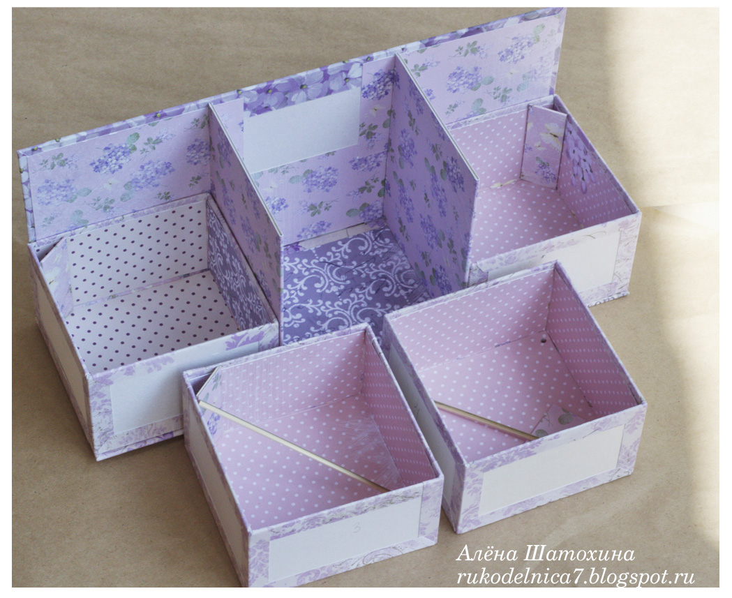 Если ящички - 9х9х5 см, то: донышко - 10х29 см, задняя стенка - 12х29см, внутренние стенки 2 шт - 12х9,5 см, крышки 3 шт - 9,5х9,5 см. Все деталди по ходу работы подгоняются до нужных! Это зависит от толщины вашего картона и бумаги!