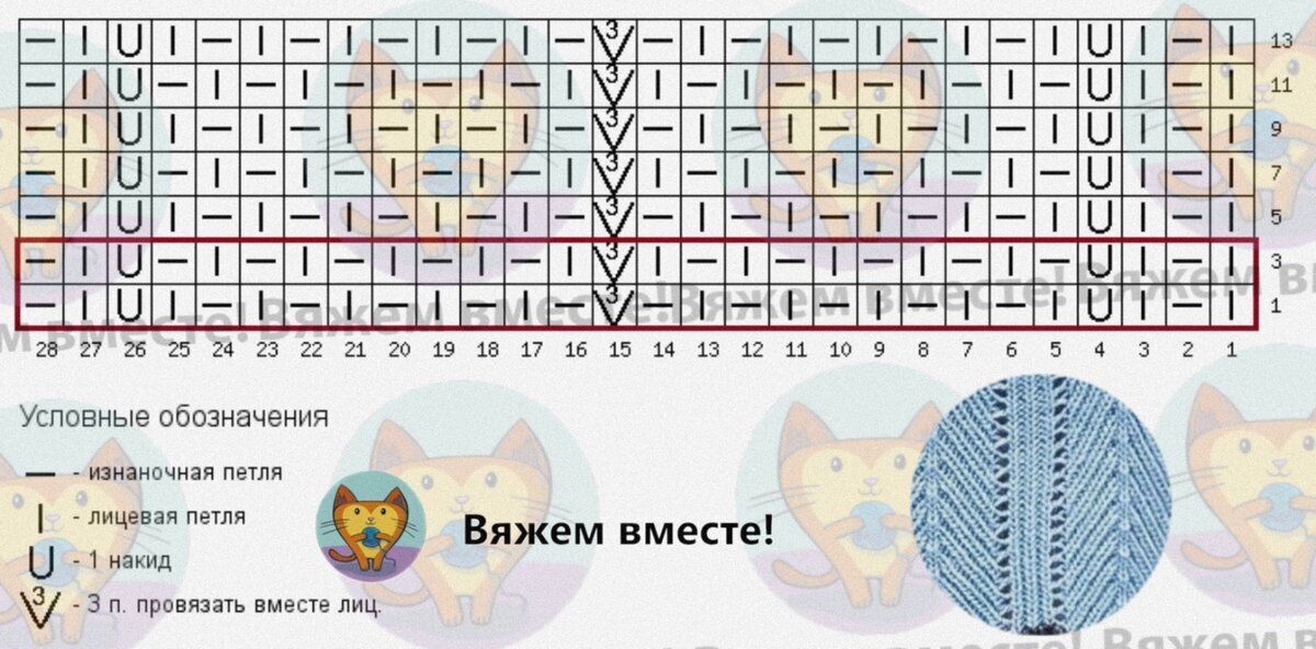 Чётные ряды узора не даны на схеме и вяжутся так, как лежат петли на спице.