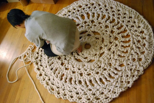 Берем схему любой ажурной салфетки, но вместо крючка и пряжи используем бельевую веревку (или тонкий канатик) и пальцы рук. То есть делаем пальчиками петельки из веревки и так вяжем по стандартной схеме салфетки. И получается вот такая красота: