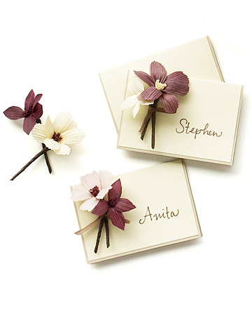 Можно сделать небольшие цветочки и прикрепить их к рассадочным карточкам.