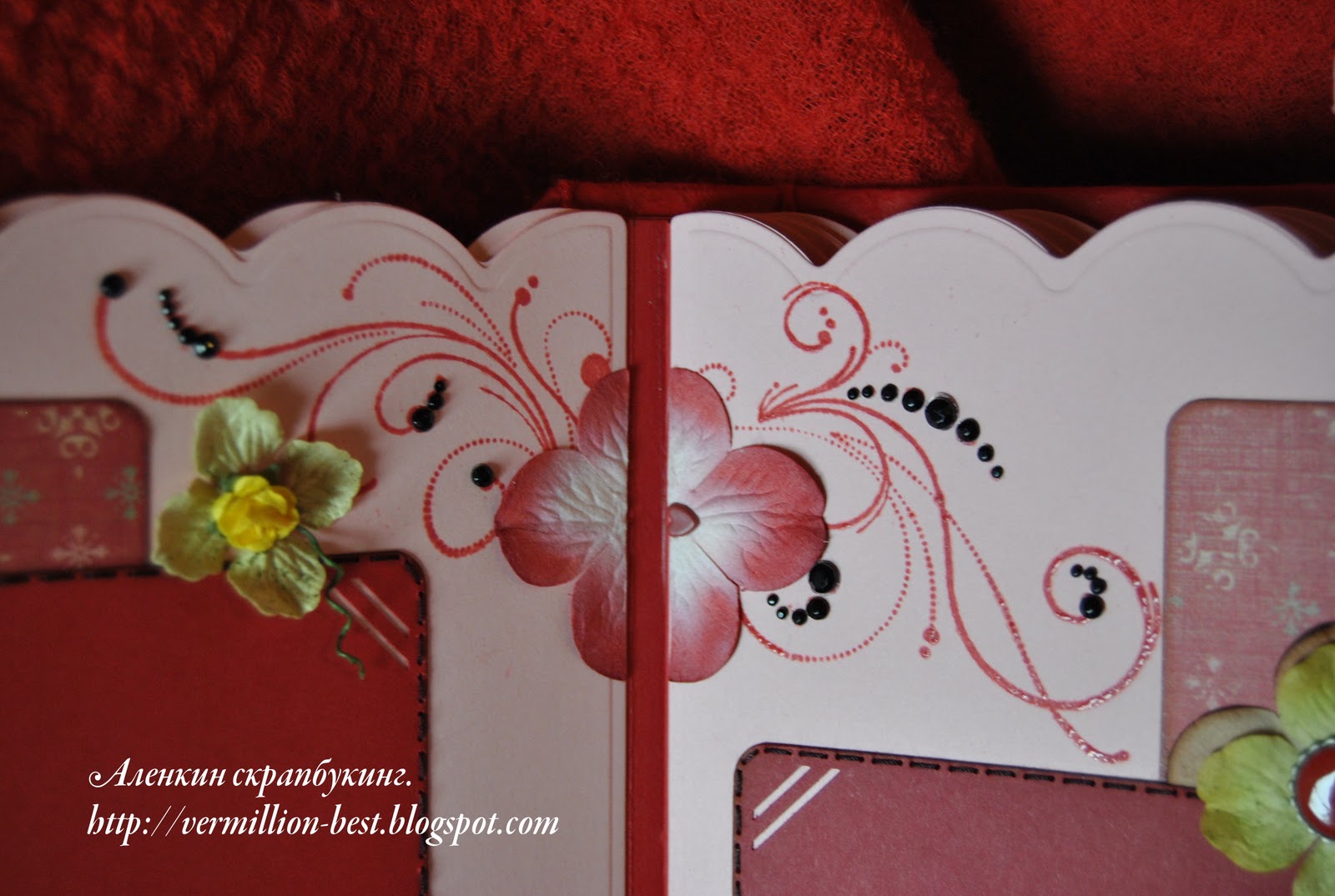 Завитки сделаны в технике «горячий эмброссинг» с помощью штампов, красных чернил, прозрачной пудры и строительного фена. Аленький берет фен у мужа на прокат в целях экономии семейного бюджета.
