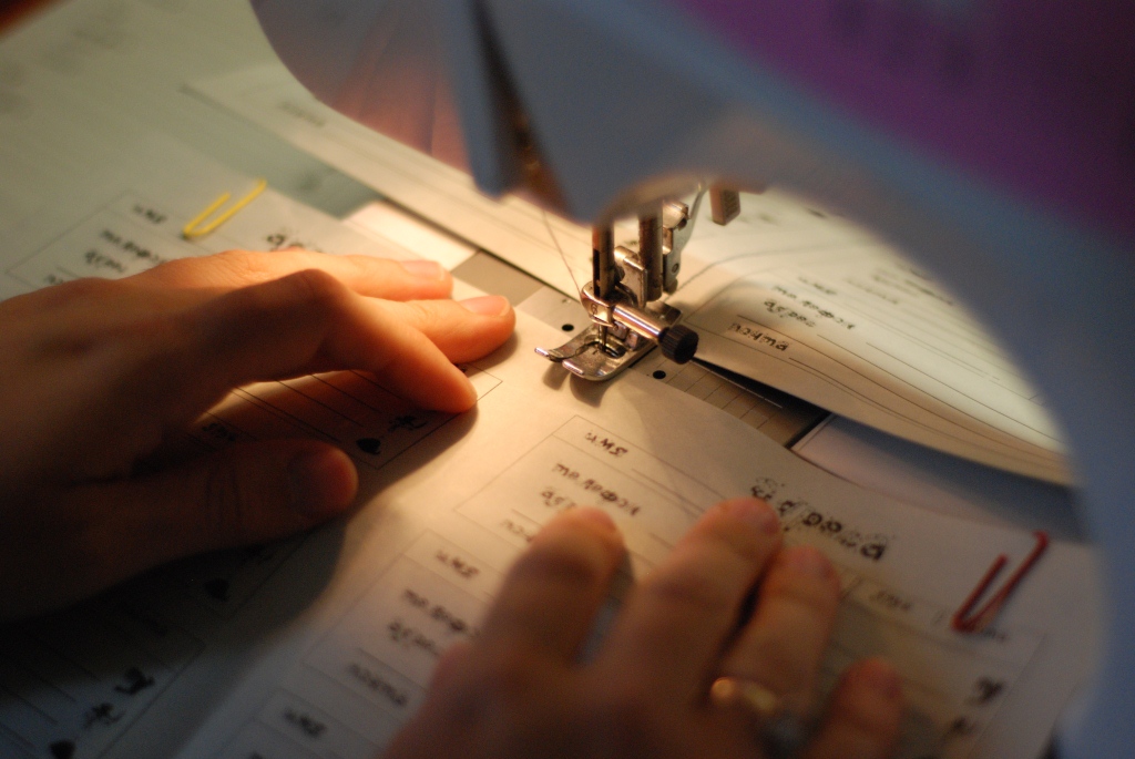 2. Теперь будем прошивать наши мини-тетрадки на швейной машинке. Заранее отложите из каждой рубрики по одной мини-тетради, к ним мы потом пришьем разделители.  Берем одну мини-тетрадь, раскрываем ее, закрепляем листы между собой канцелярскими скрепками (чтобы бумага не «ездила») и прошиваем по середине листов. Так делаем со всеми мини-тетрадками, чтобы работа шла быстрее мы не будет отрезать нити каждый раз, когда закончится тетрадь, мы просто продолжим прошивать вторую тетрадь (смотрите фото ниже),третью, четвертую и т.д.