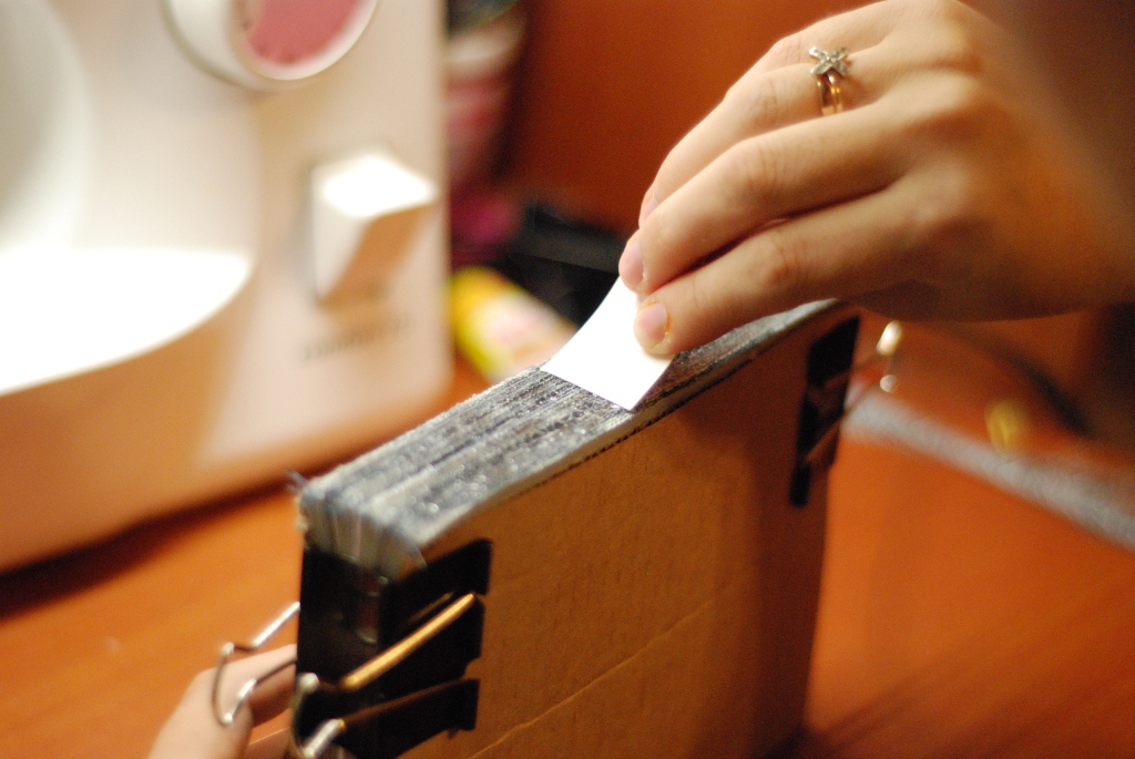 14.Берем ненужную бумагу, для создания черновой обложки. Приклеиваем ее к нашим вырезанным заготовкам.
