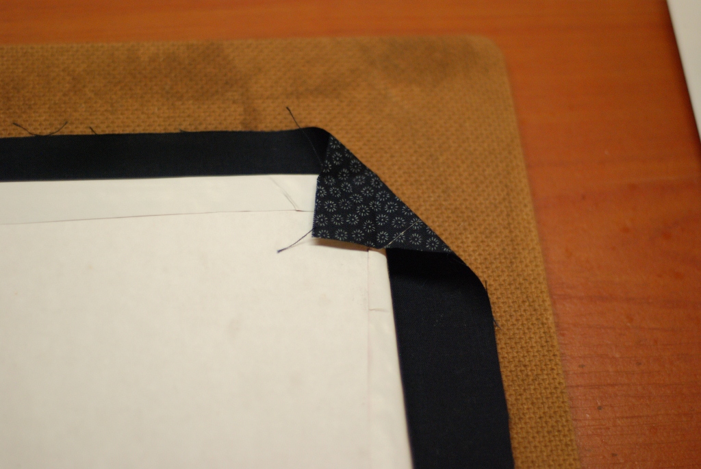 22. Теперь будем обтягивать обложку тканью. Я всегда начинаю приклеивать углы, мне так удобнее, вы же можете наоборот сначала приклеить бока, а потом и углы.