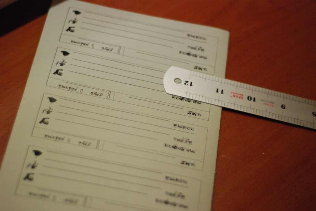 5.Закрепляем канцелярскими скрепками и прошиваем посередине. Потом при помощи линейки и резака убираем излишки.