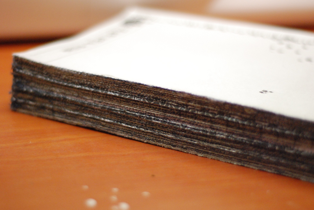 4. Берем мини-тетрадку (из тех мини-тетрадок, которые мы отложили и не прошивали) и прикладываем к одной из ее сторон разделитель, как показано на фото: