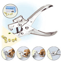 Сначала необходимо пробить для люверсов отверстия. Это делается дыроколом, размещённым сбоку от инструмента. При использовании щипцов необходимо всего лишь несильно сжать ручки инструмента - особых усилий здесь не требуется.