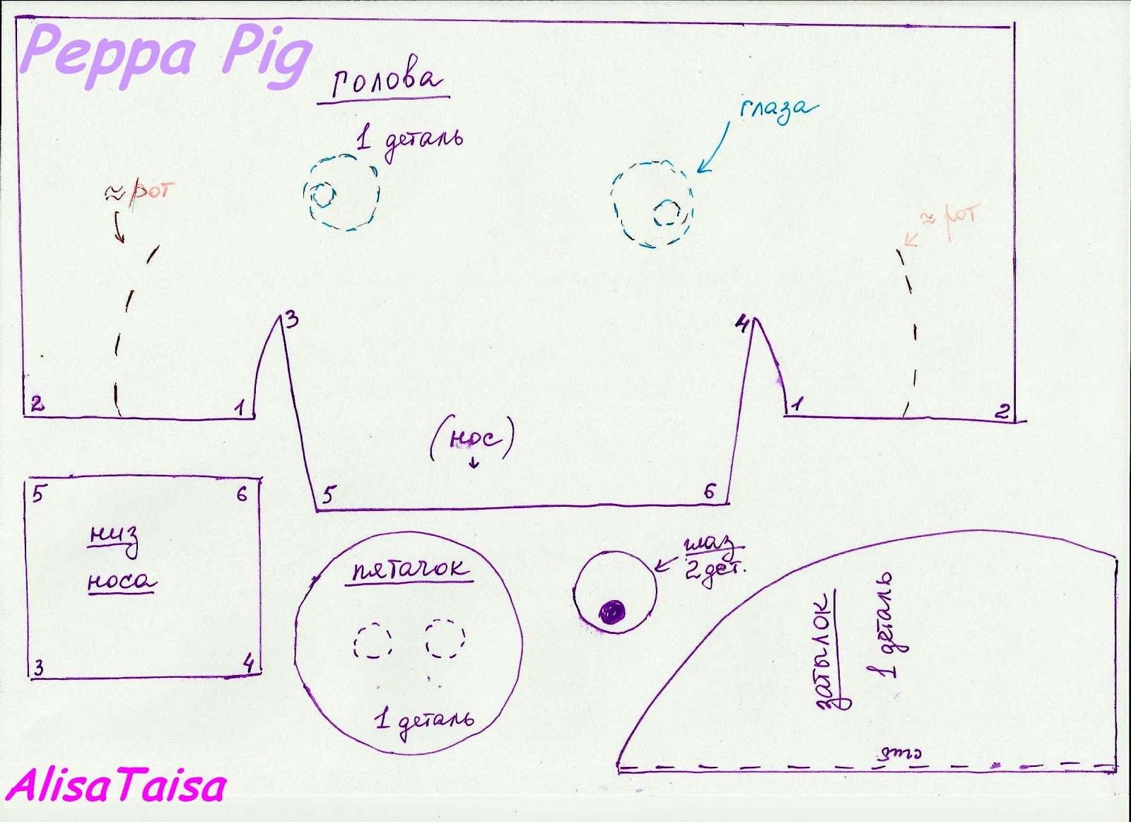 5. Самое сложное - голова (точнее, пятячок). Постаралась пояснее показать, как пришивать низ носа к верху - циферка к циферке: 1+1, 2+2 и т.д.