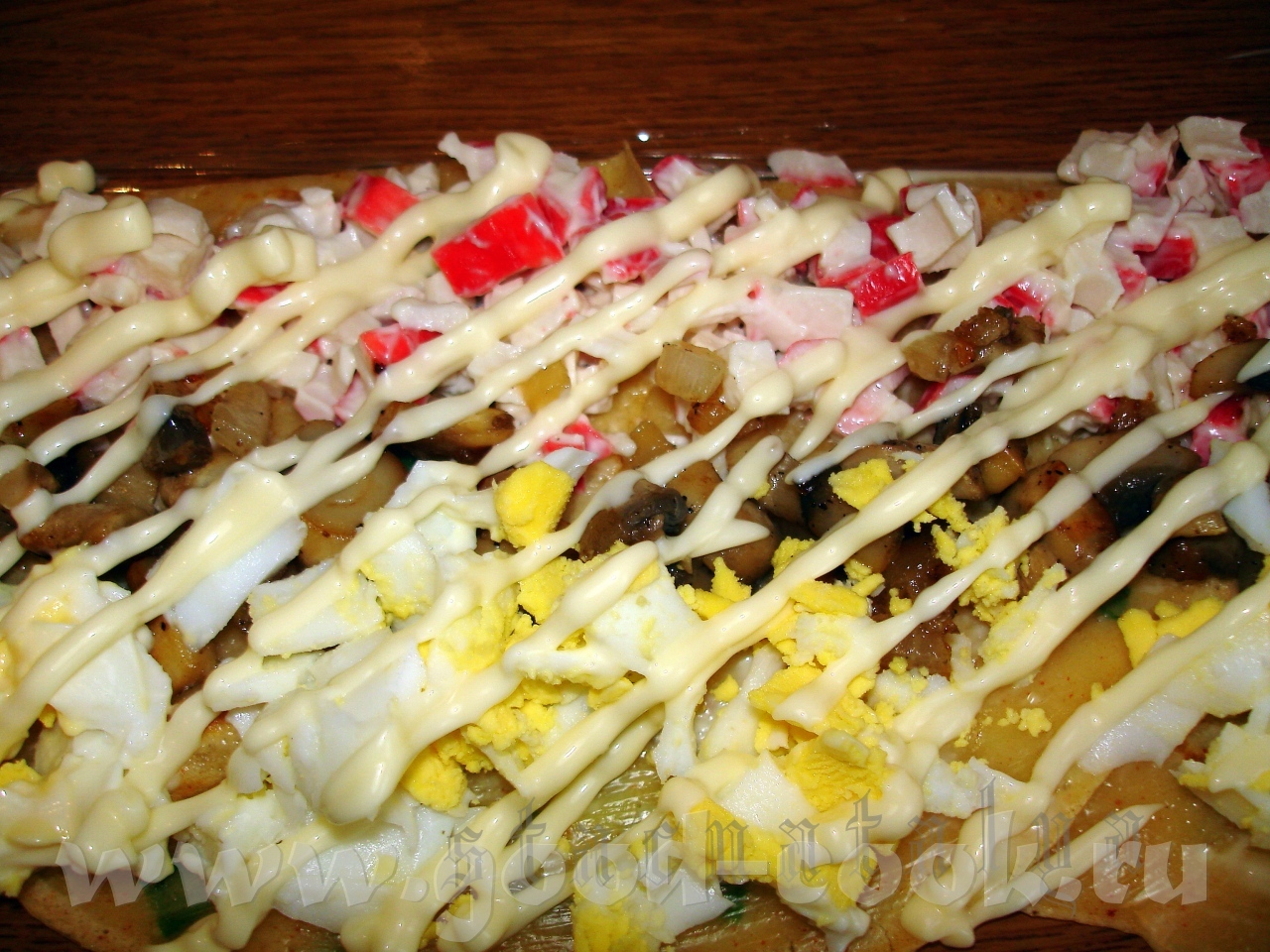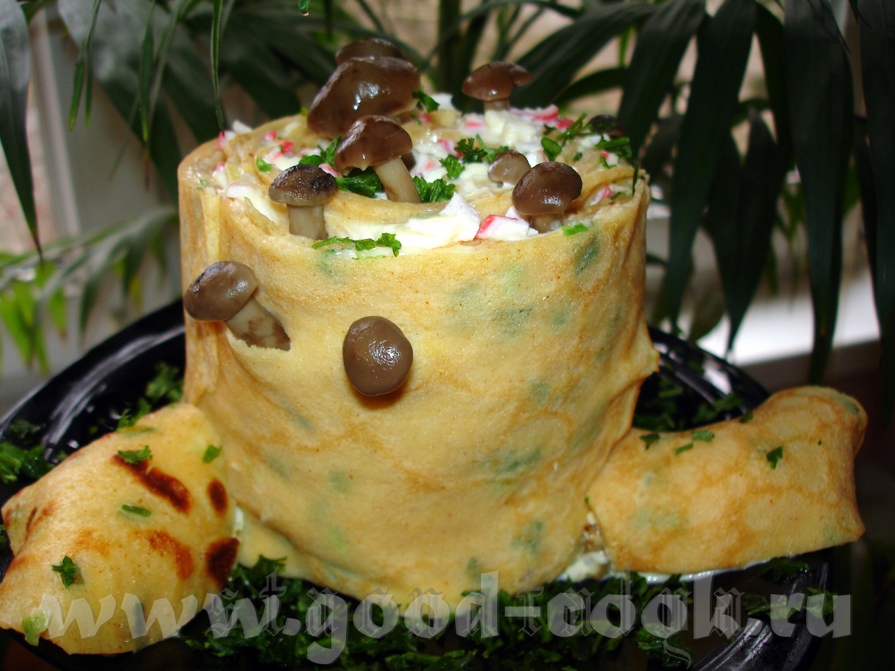 Сначала из почти 2-х стаканов Айрана с добавлением паприки, репчатого лука и петрушки испекла блинчики (яйцо, мука, подсол.масло и сахар немного, соль не добавляла, Айран очень солёный попался) Я взяла 250 мл молока, 2 яйца, соль, паприку , 1 ст л растит. масла, зеленый лук и муку Сварила 3 яйца, немного картофеля, морковки отжала и потёрла грузди, смешала с луком и укропом блинчики(4шт диаметра 26см) порезала почти пополам (одна часть побольше) картофель, морковь, яйца потёрла на крупной тёрке по-отдельности. В каждую часть добавила по ложке майонеза. Всего у меня на весь пень ушло около 200гр. майонеза. В картофель покрошила укроп. Вдоль всего стола раскатала целофановые пакеты примерно 1м длиной, уложила лицевой стороной блинчики вниз и внахлёст, чтобы те, что побольше оказались в конце(слева). А справа начала крутить пенёк, сначала пошли яйца (каждую начинку надо плотнее примять к блинчику) потом грибы, блинчики я чуть-чуть мазнула майонезом и мягким сыром типа "Хохланд" потом морковь, закончила картофелем Закручивать рулет проще всего по принципу коврика в суши - аккуратно подтягивая и загибая пакет. Стыки между блинчиками подмазывала мягким сыром кисточкой. Начинка, что будет немного выпадывать, пригодится для наполнения "корней". Я разложив блинчики, чуть смазала их майонезом. Начинку брала такую : крабовые палочки (6 шт), шампиньоны жареные с луком ( 300 гр грибов и 1 луковица ) и два яйца ( вареных) Начинку ложила вдоль блинчиков. Крабовые палочку смешала с майонезом, грибы и яйца ложила просто как есть. Потом всю начинку чуток полила майонезом. [показать] И вот так с начинкой [показать] Перенесла его на блюдо, обрезала торчащие снизу хвостики блинчиков - они пригодятся для "корней" неровности закрасила мягким сыром, прилепила "корешки" накрыла их блинными обрезками, начала украшать. Украшать зеленью и грибами лучше после пропитки перед подачей, чтобы не завяли насадила зелени и грибов А вкусно то как !!! [показать] [показать] Девочки, обязательно попробуйте сделать !!! Я думаю начинку можно любую,