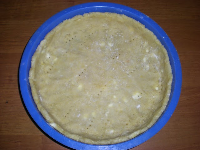Тесто вынуть из холодильника, выложить в форму (у меня силиконовая форма диаметром 24 см) и пальцами равномерно распределить в виде пласта с небольшими бортиками (где-то 3 см.). Наколоть тесто вилкой и вернуть в холодильник.