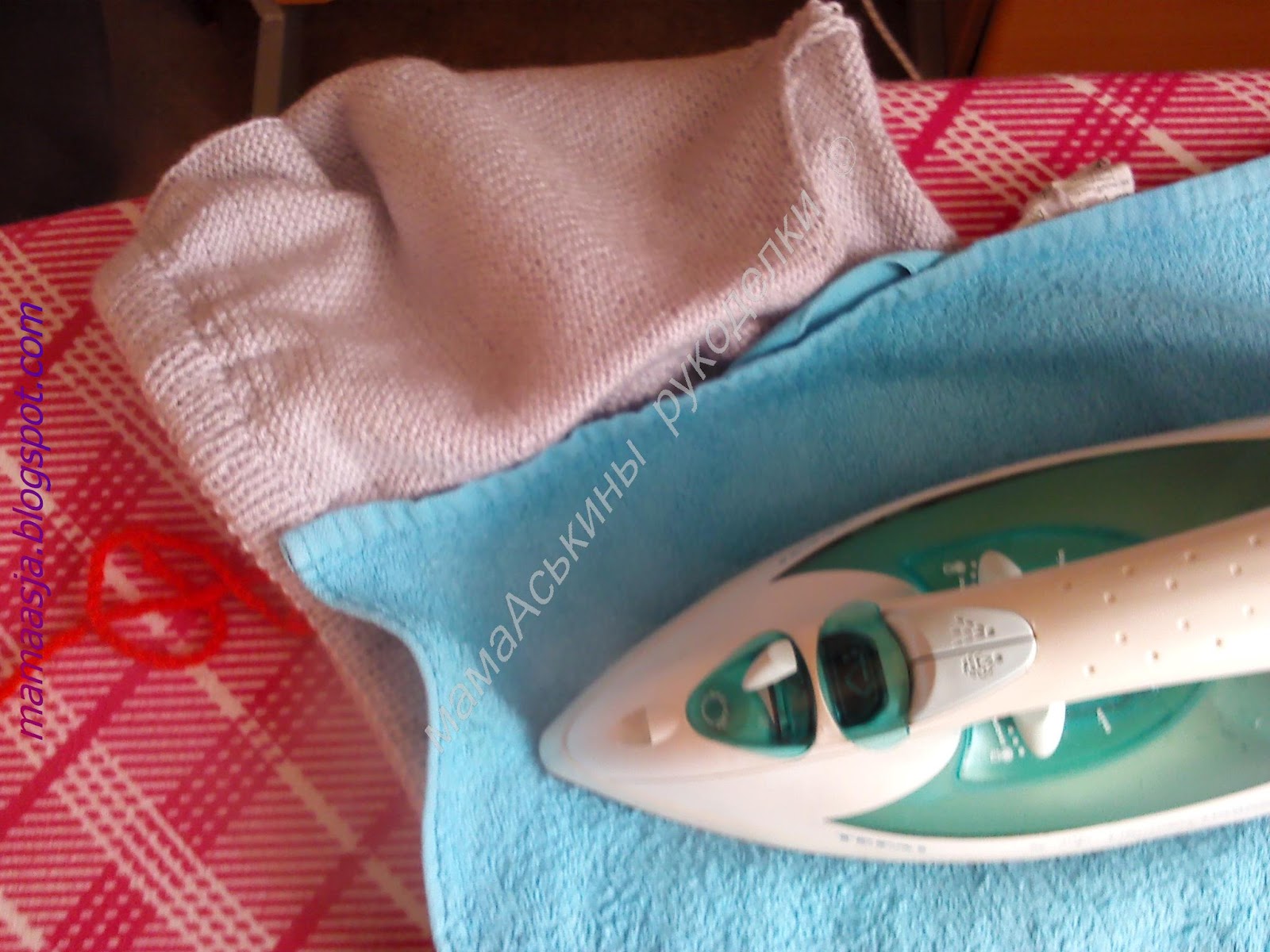 95. Закрыть петли и подшить к первому ряду резинки с изнаночной стороны. В образовавшийся подгиб вставить широкую резинку и шнурок