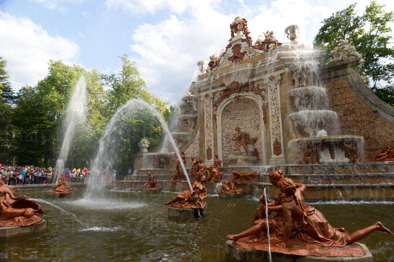 Французский дизайнер Рене Карлье использовал естественный наклон участка в дизайне дворцовых площадок для улучшения осевых визуальных перспектив и обеспечения достаточной высоты для воды для 26 скульптурных фонтанов в формальных садах и ландшафтном парке .