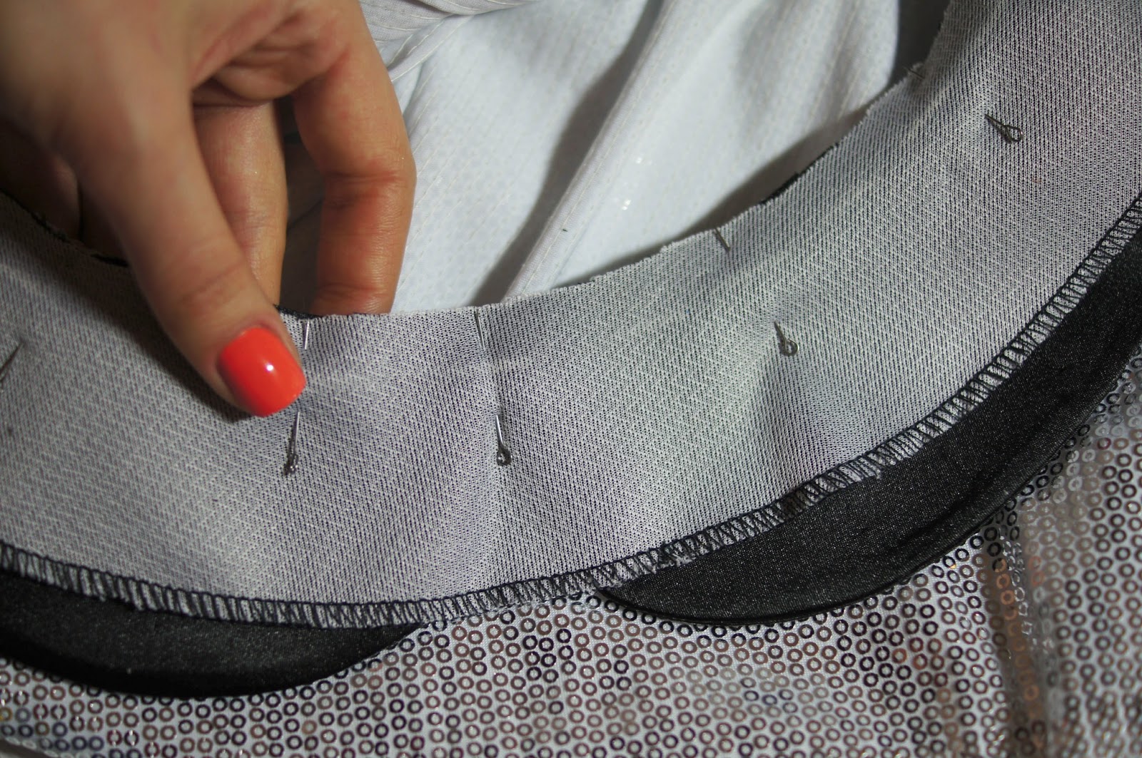 6. Ткань с паетками очень колется, поэтому обязательно обметайте на оверлоке боковые припуски и пройму рукава. Я предлагаю по тому же принцыпу сделать рукава и низ блузы с обтачкой.